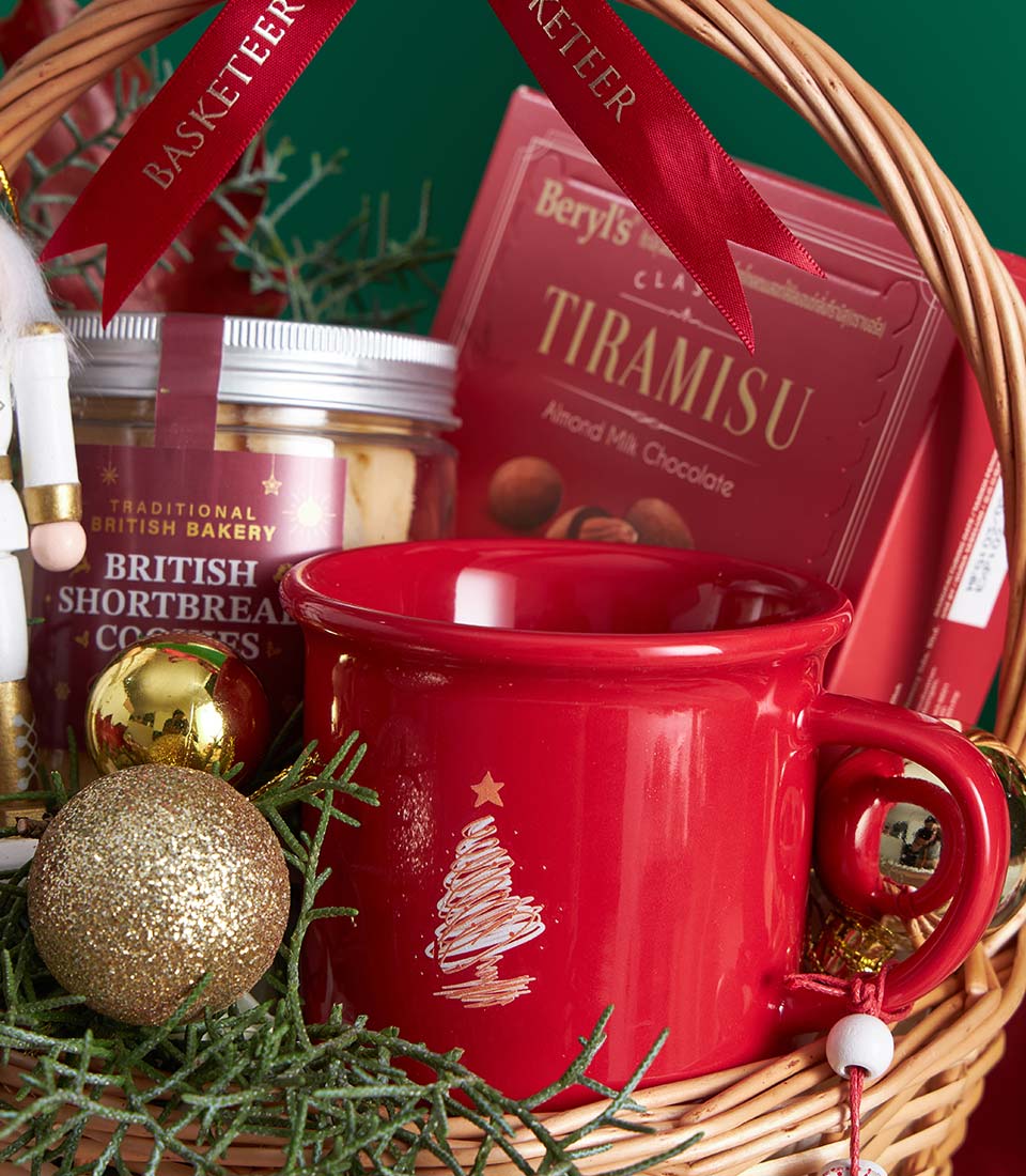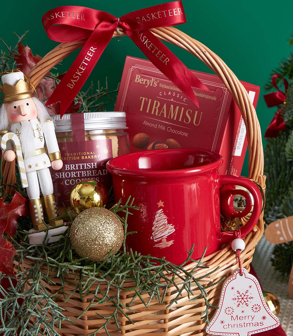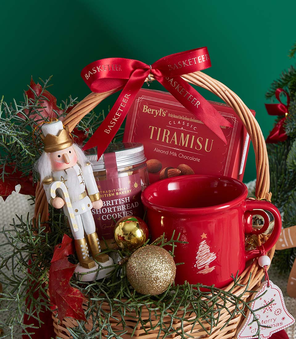 Christmas Gingerbread & Chocolate Basket Gingerbread Cup Edition A charming Christmas gift basket combining a freshly baked gingerbread man cookie from Charlotte Bakery with Beryls tiramisu milk chocolate, paired with a festive biscuit cup and classic holiday décor. Designed to feel joyful, sweet, and gift-readyfinished with Basketeers signature Christmas presentation.