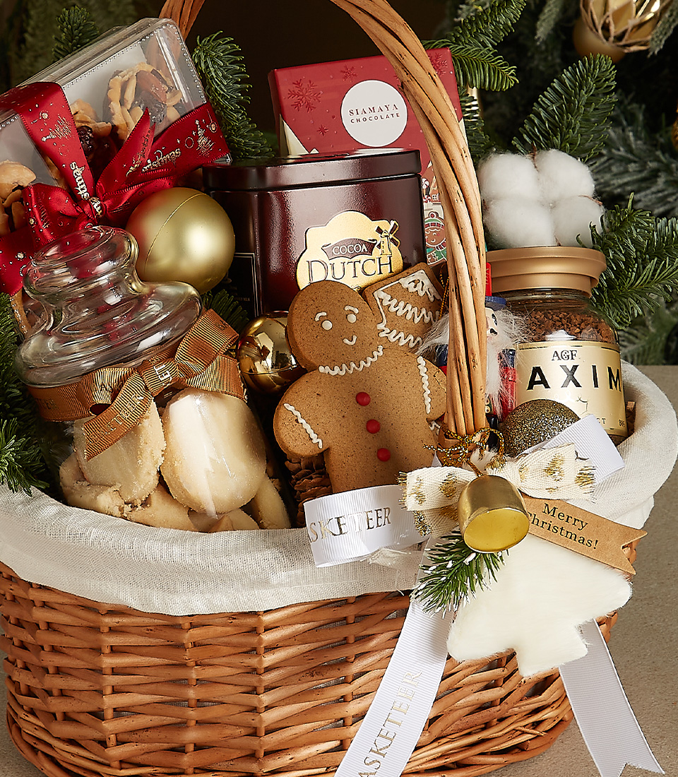 Golden Indulgence Christmas basket with cookies, chocolates, coffee, and gingerbread. Perfect holiday gift for family and corporate events.