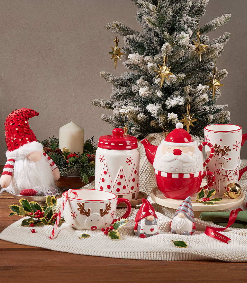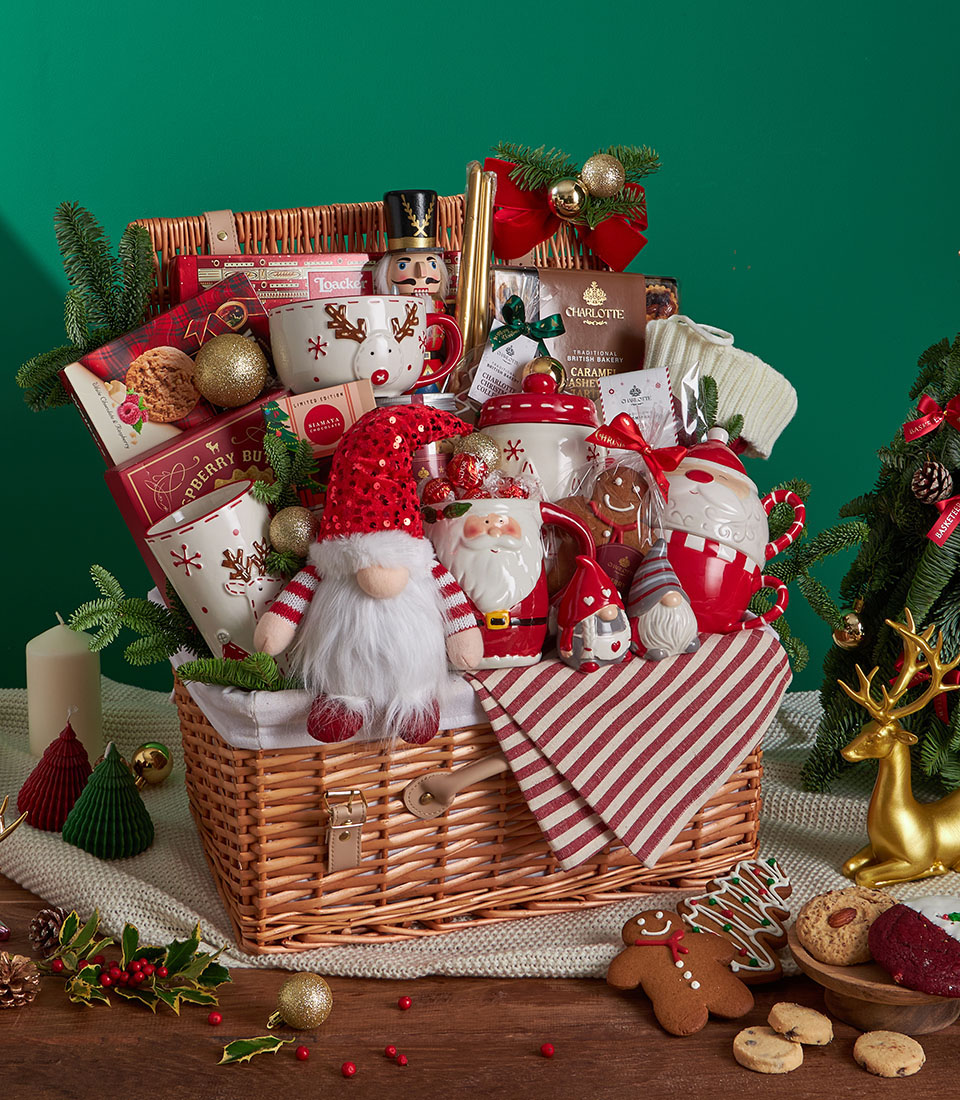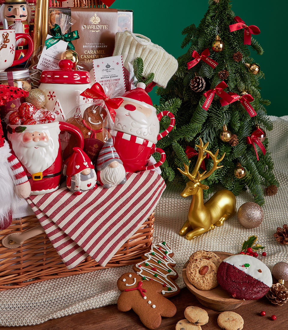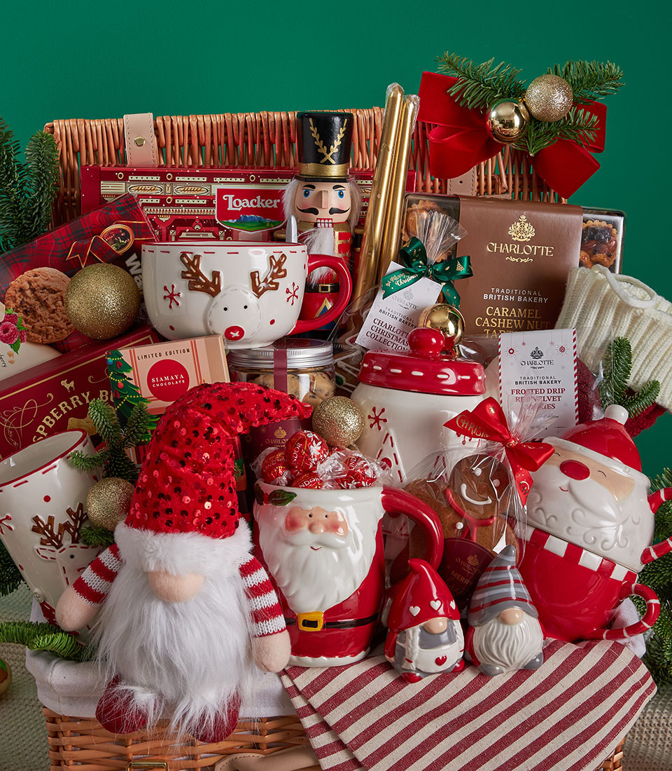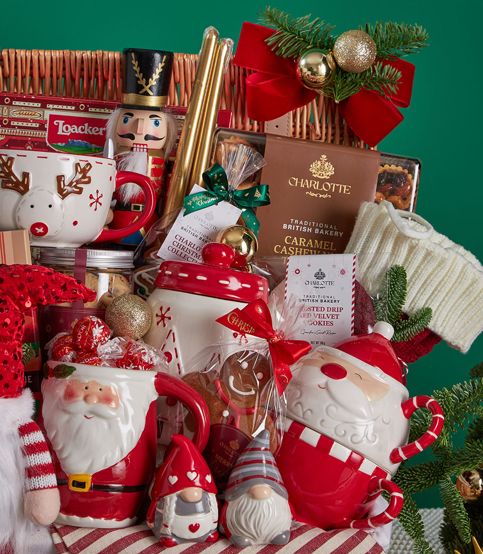 Grand Festive Christmas Picnic Hamper Classic Family Celebration Edition A joyful and abundant Christmas picnic hamper filled with premium festive biscuits, indulgent chocolates, Charlottes signature holiday bakes, and charming Christmas tableware. Thoughtfully styled in a spacious picnic basket with traditional red-and-white accents and decorative keepsakes, this collection is designed to celebrate warmth, togetherness, and timeless Christmas cheer.