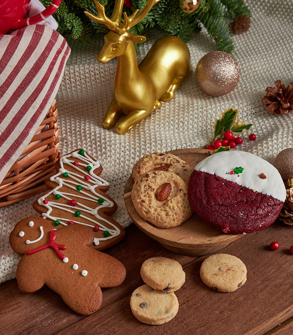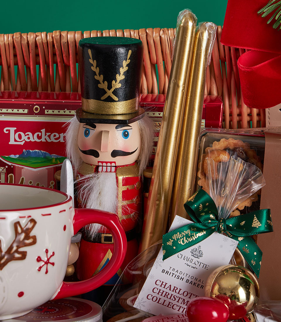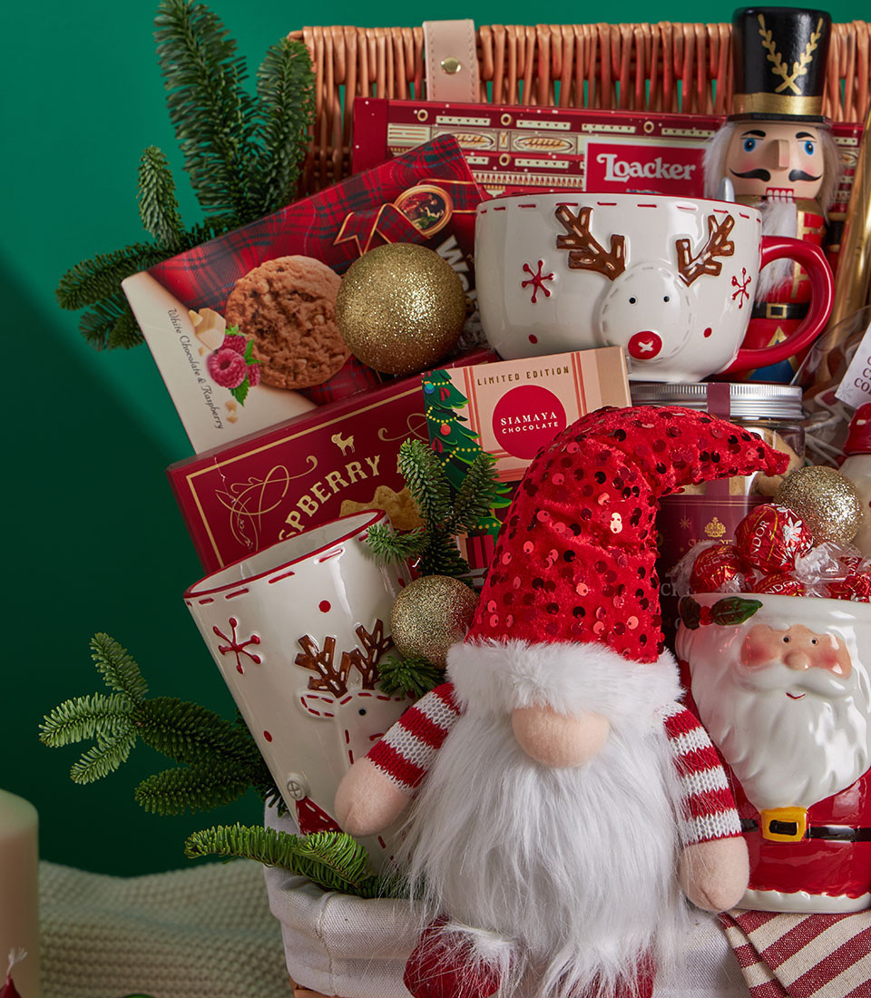 A lavish Christmas gift basket featuring an abundant selection of festive cookies, nut tartlets, premium chocolates, and charming Christmas tableware, beautifully styled with Santa accents, nutcracker décor, and cosy holiday details. A joyful and impressive Christmas gift with same-day delivery in Bangkok.