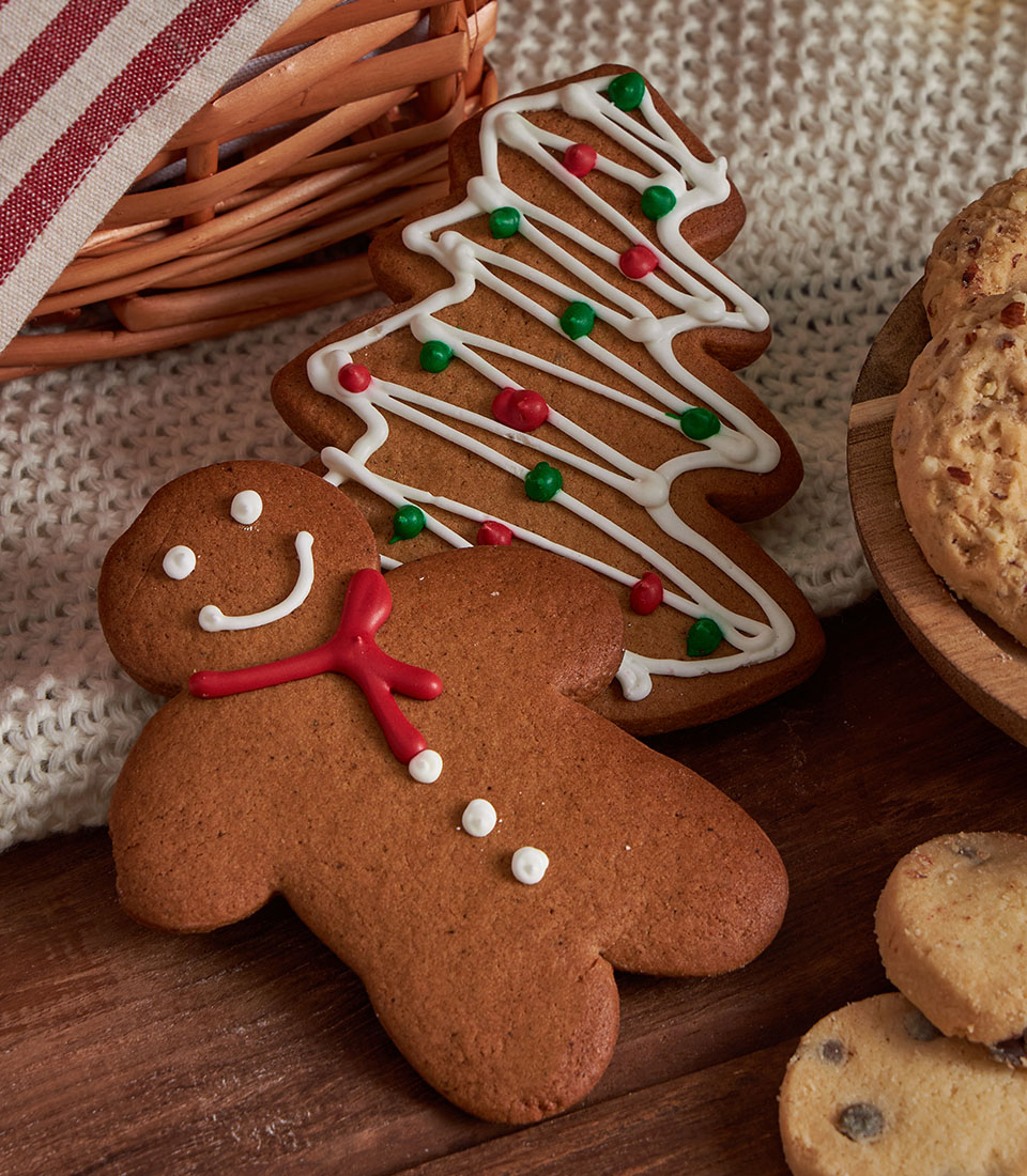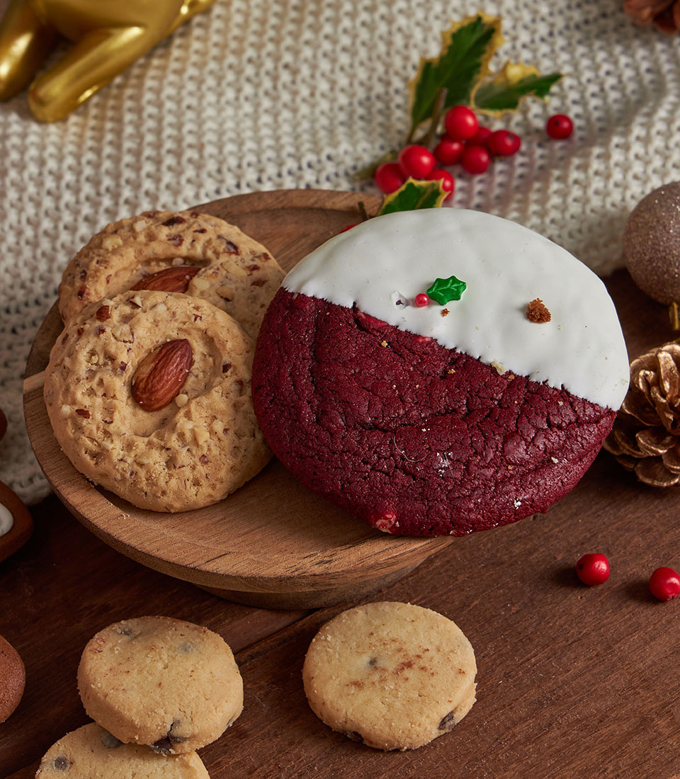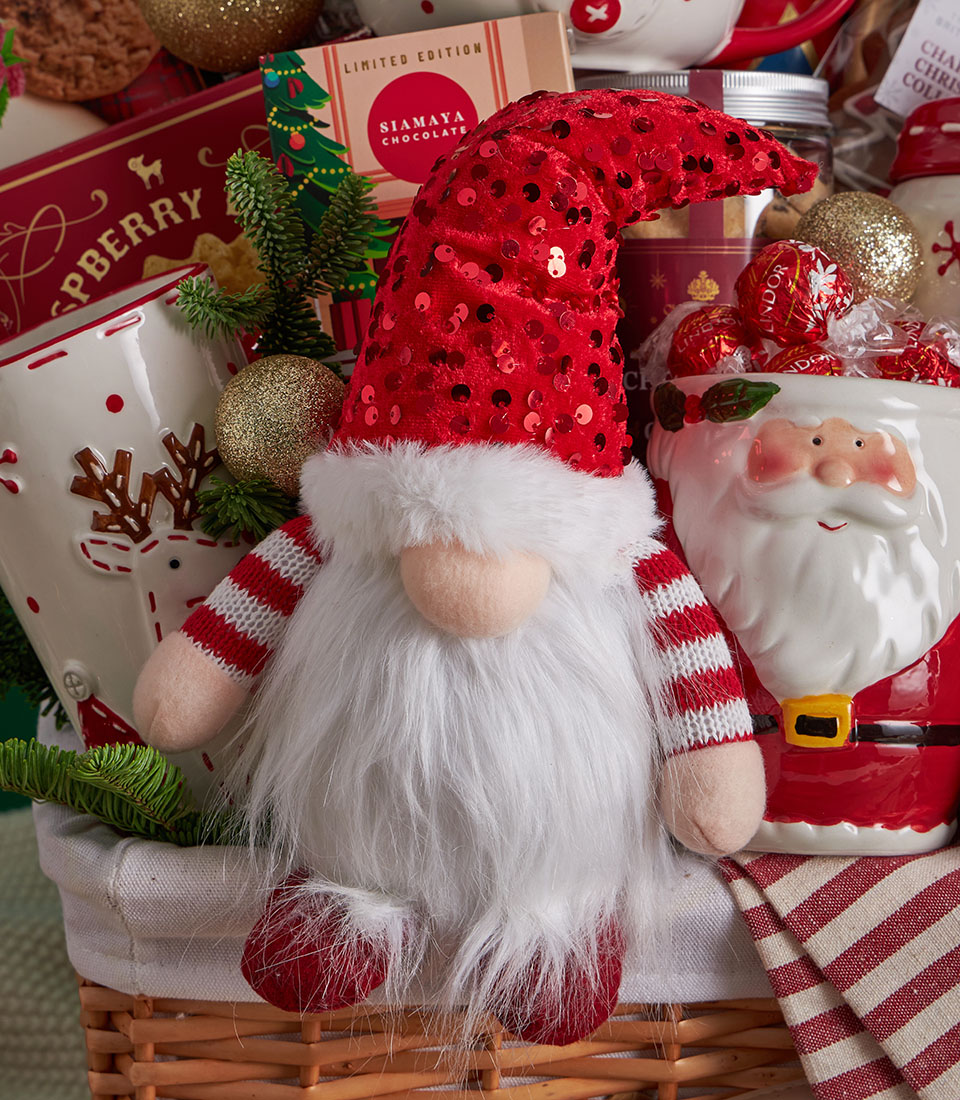 A lavish Christmas gift basket featuring an abundant selection of festive cookies, nut tartlets, premium chocolates, and charming Christmas tableware, beautifully styled with Santa accents, nutcracker décor, and cosy holiday details. A joyful and impressive Christmas gift with same-day delivery in Bangkok.