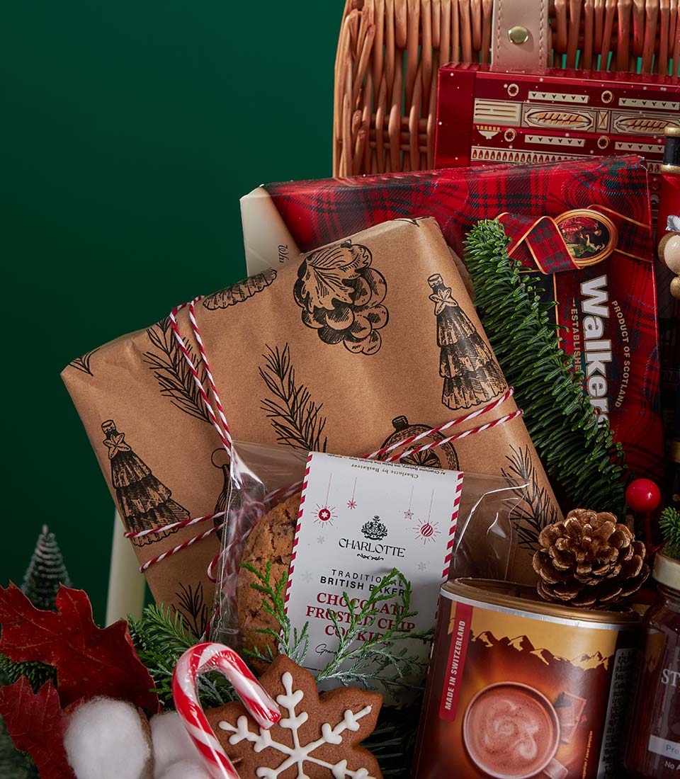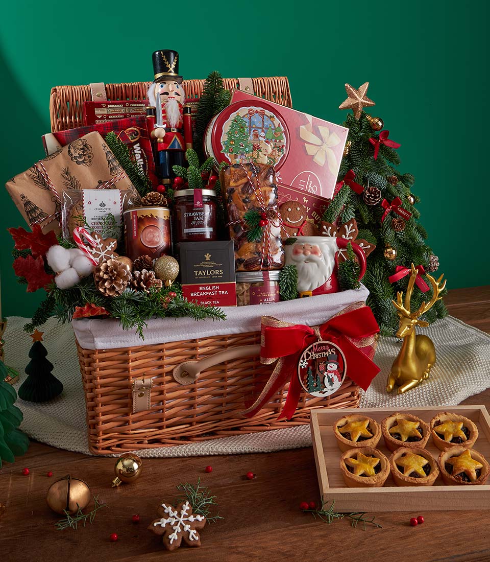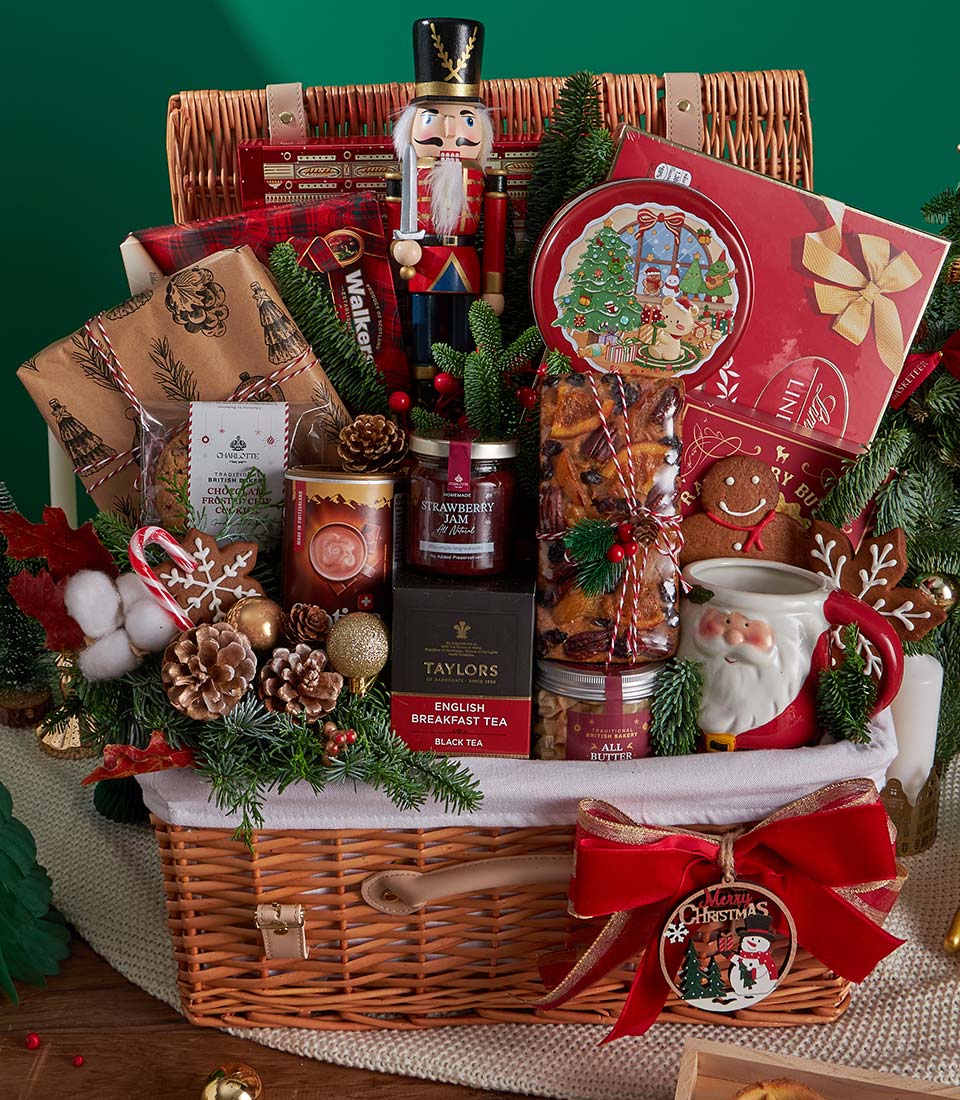 Grand Festive Christmas Picnic Hamper Traditional Holiday Celebration Edition An abundant Christmas picnic basket filled with beloved festive biscuits, classic British treats, premium chocolates, warming tea, and charming holiday keepsakes. Elegantly arranged in a spacious wicker picnic basket with traditional Christmas accents, this luxurious hamper captures the joy of sharing, celebration, and timeless seasonal traditionsperfect for meaningful Christmas and New Year gifting.