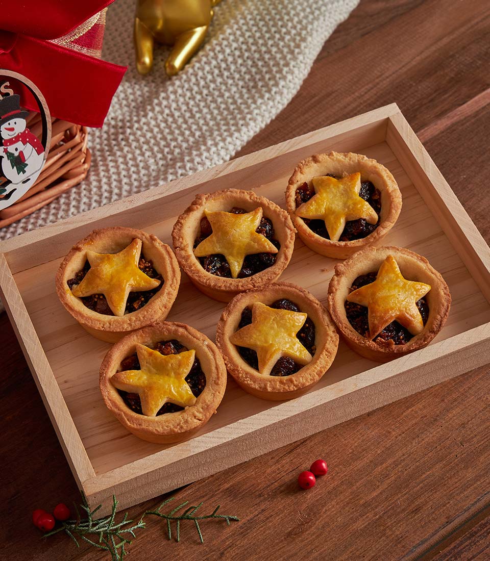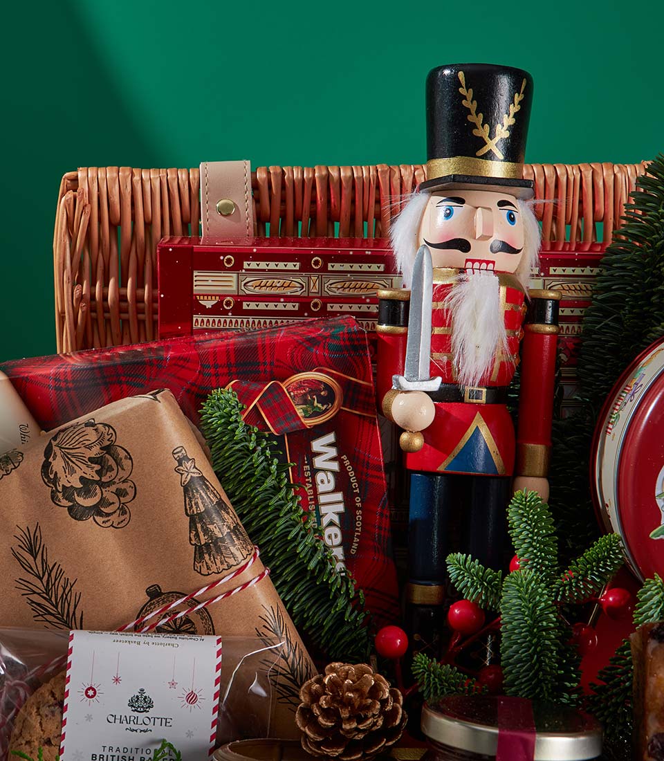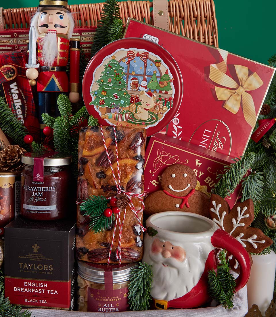 A magnificent Christmas gift basket featuring festive cookies, traditional mince pies, premium chocolates, fruitcake, strawberry jam, and classic English breakfast tea, beautifully styled with a nutcracker figure and timeless Christmas décor. An exceptional Christmas gift with same-day delivery in Bangkok.