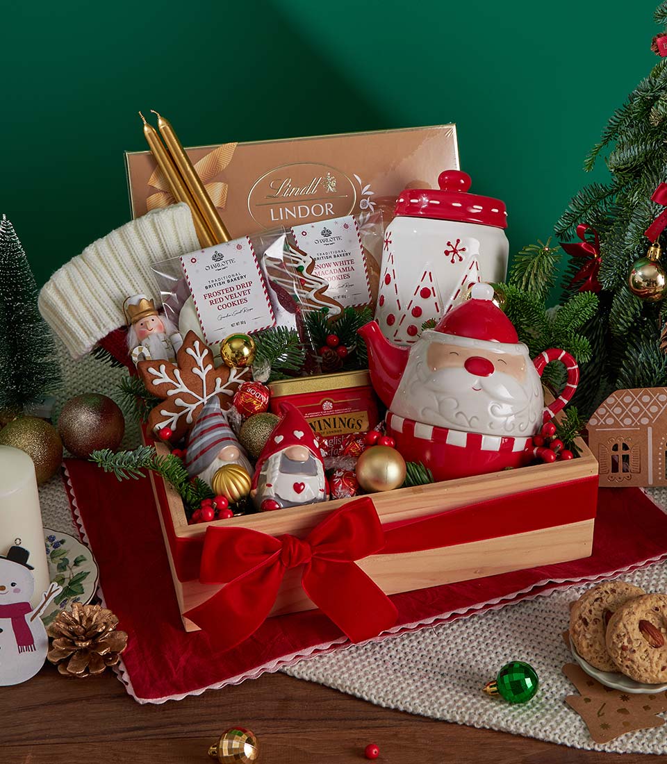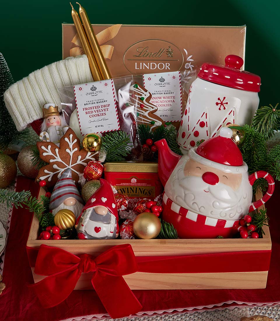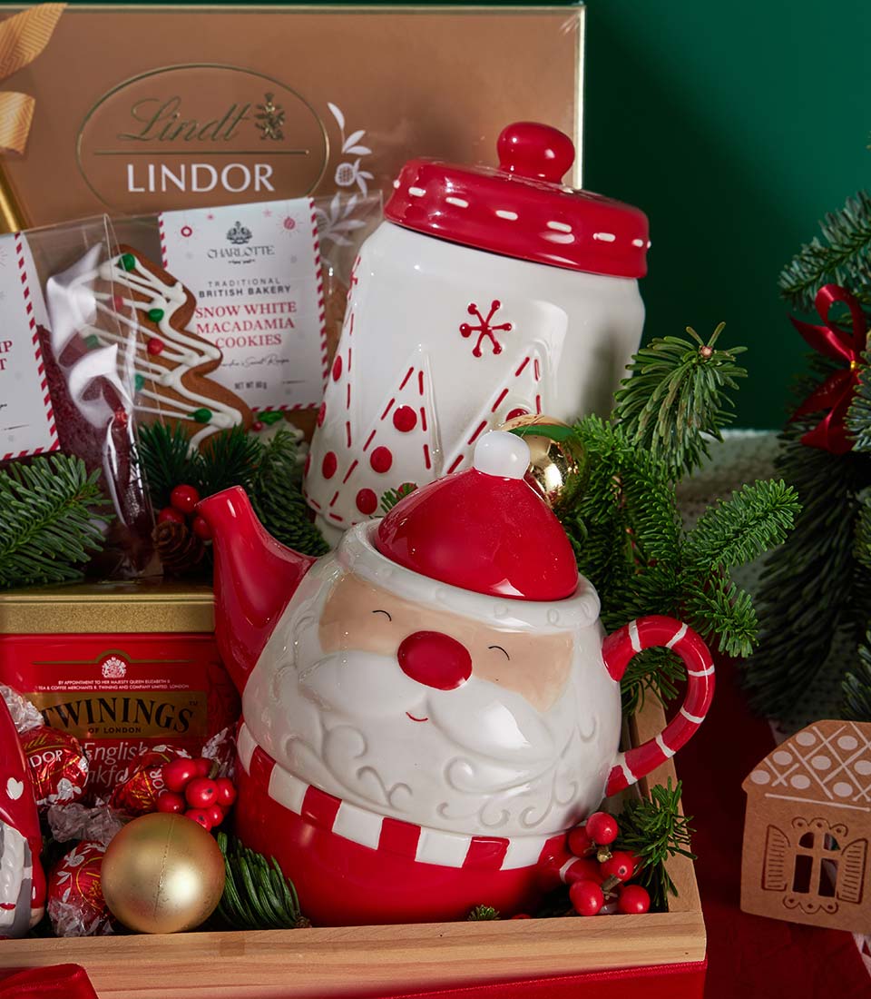 A luxurious Christmas gift set featuring festive cookies, premium chocolate, and classic English breakfast tea, beautifully arranged with elegant holiday décor and a charming Christmas teapot. A refined seasonal gift with same-day delivery in Bangkok.