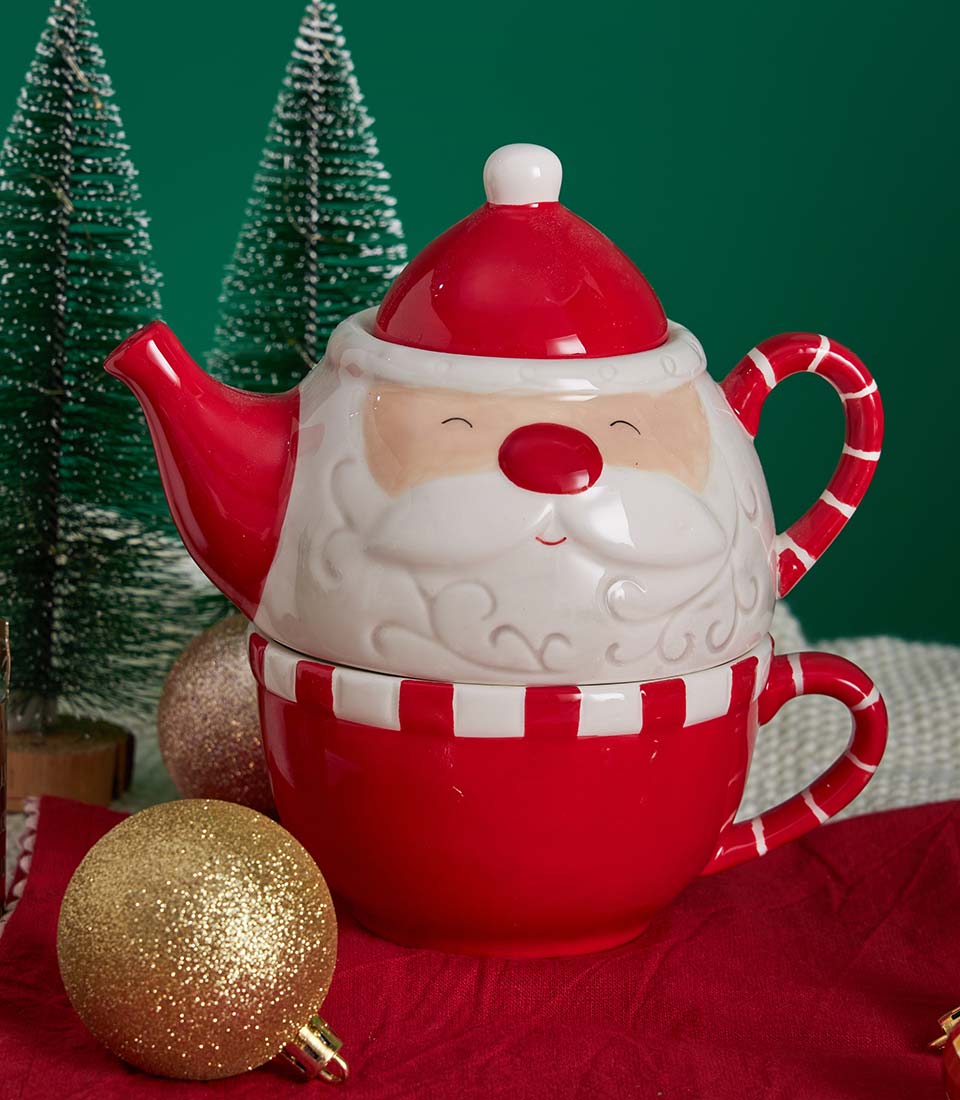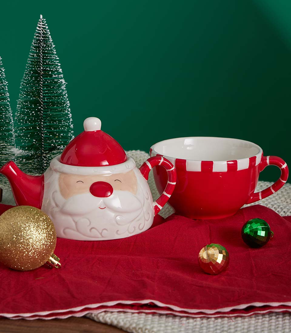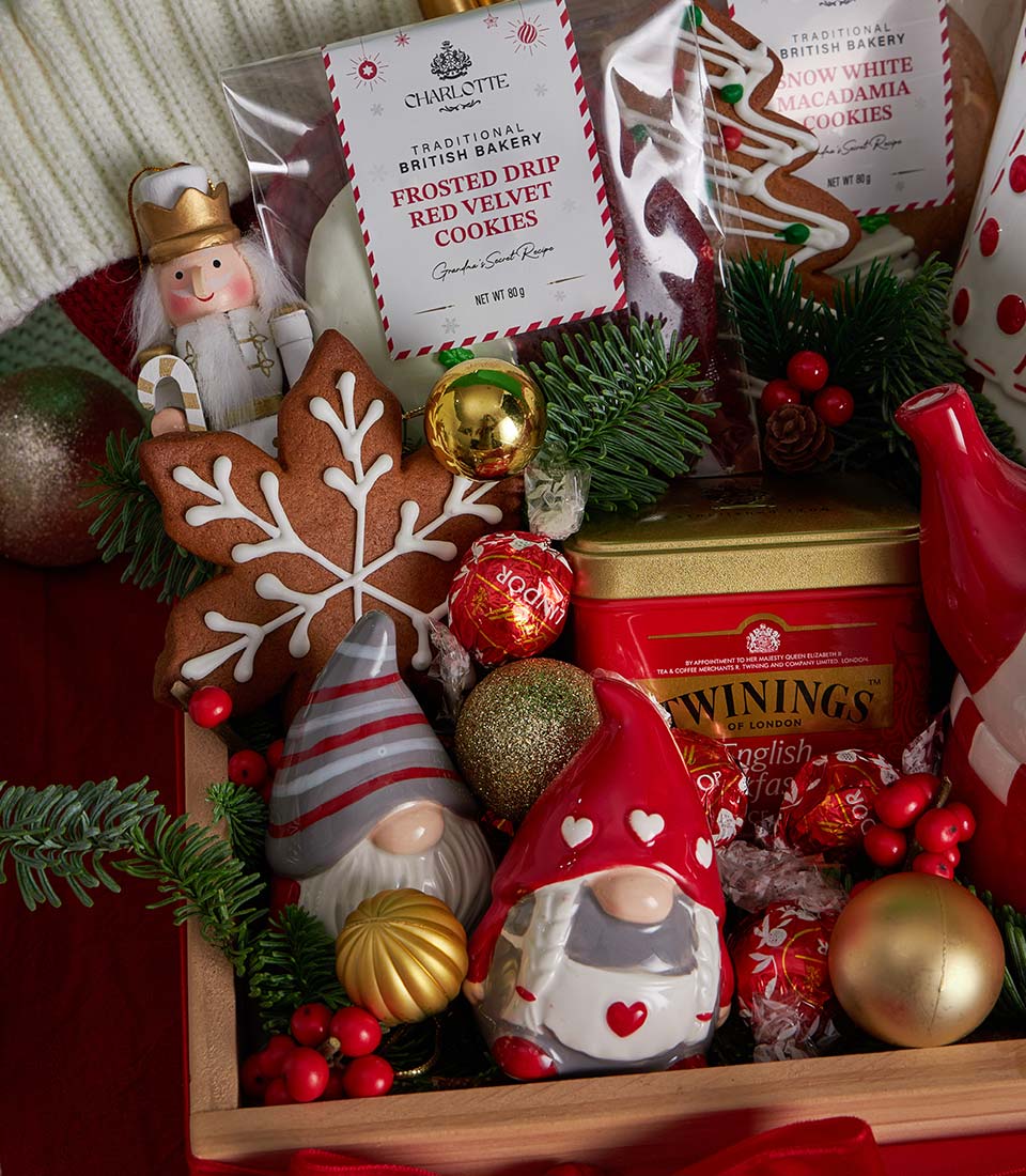 A luxurious Christmas gift set featuring festive cookies, premium chocolate, and classic English breakfast tea, beautifully arranged with elegant holiday décor and a charming Christmas teapot. A refined seasonal gift with same-day delivery in Bangkok.