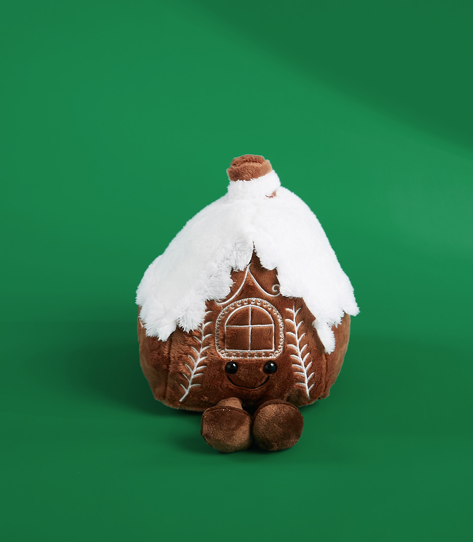 Adorable snowy gingerbread house plush set, perfect for cozy holiday decor or as festive gifts. Soft, huggable, and holiday-themed.