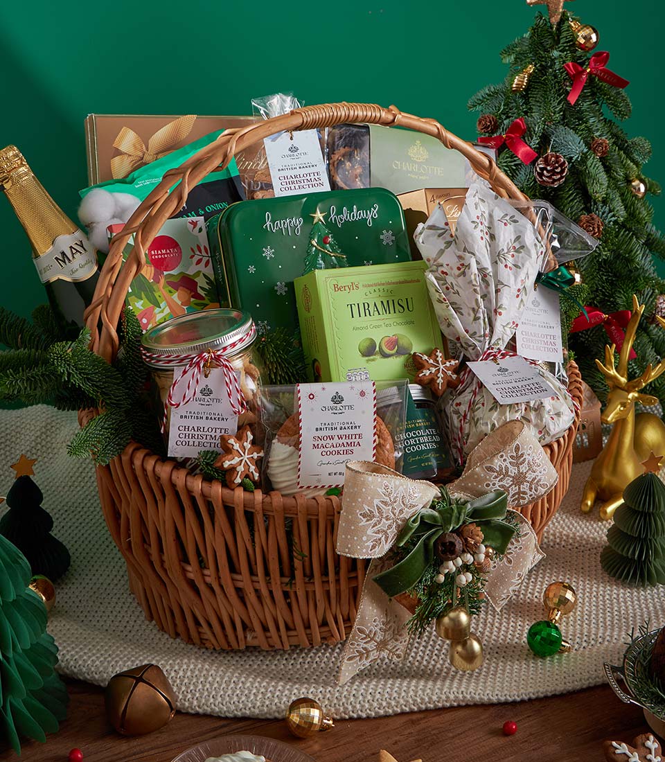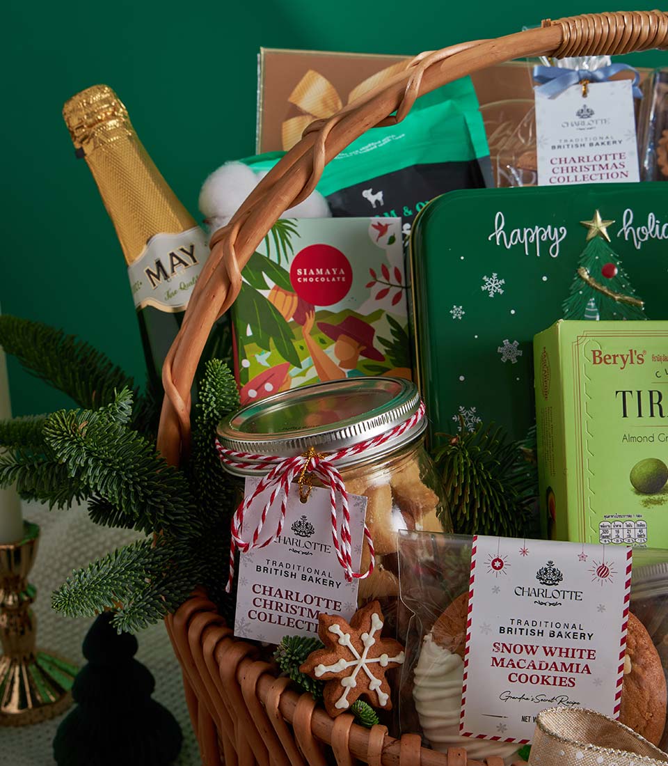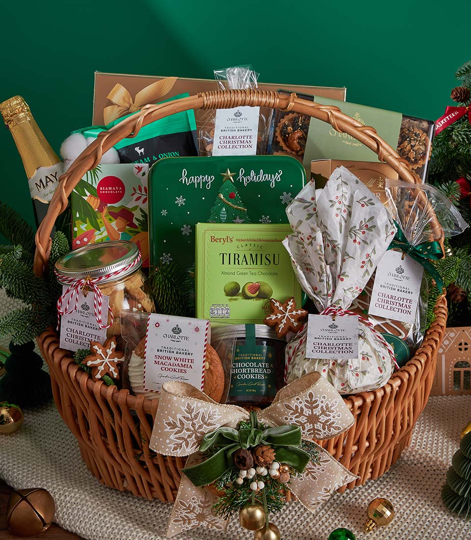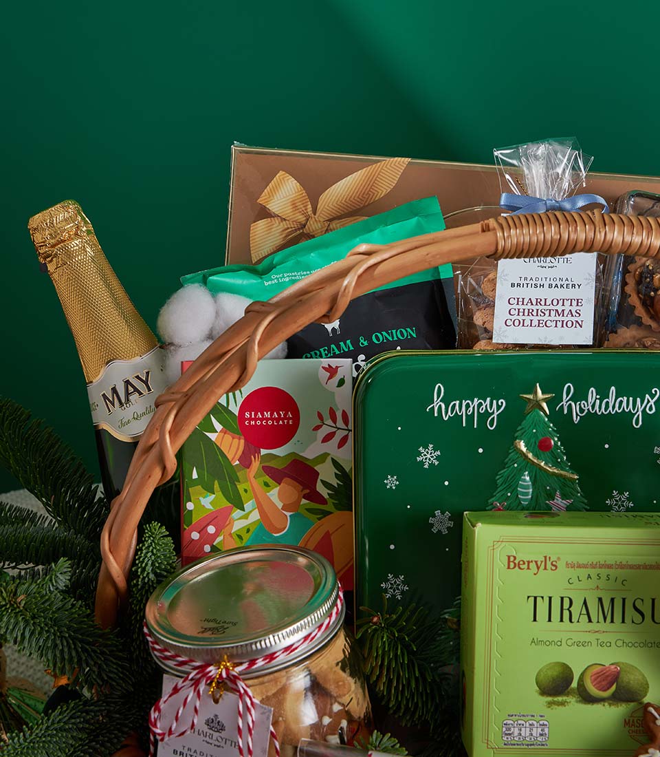 Ultimate Luxury Christmas Gourmet Gift Basket Green Holiday Abundance Edition An opulent Christmas gourmet basket curated with an extensive selection of festive cookies, premium chocolates, traditional British Christmas pudding, savoury snacks, and refined beverages. Elegantly arranged in a handmade wicker basket with lush green holiday accents, this luxurious collection embodies abundance, celebration, and heartfelt generosityperfect for premium Christmas and New Year gifting in Bangkok.