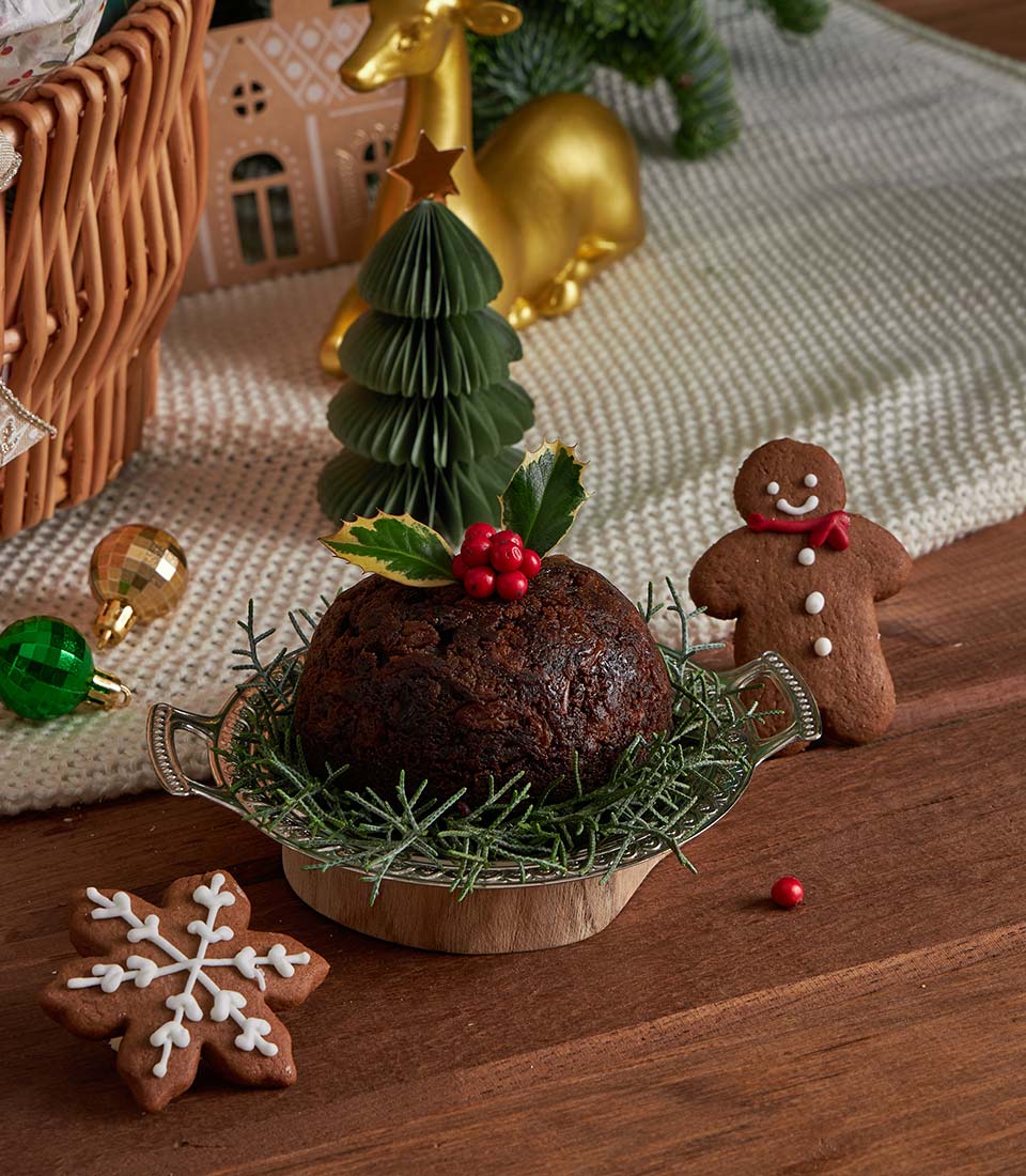 An opulent Christmas gift basket featuring premium chocolates, festive cookies, British Christmas pudding, gourmet tartlets, and refined savoury snacks, beautifully styled with elegant green holiday décor. A truly luxurious Christmas gift with same-day delivery in Bangkok.
