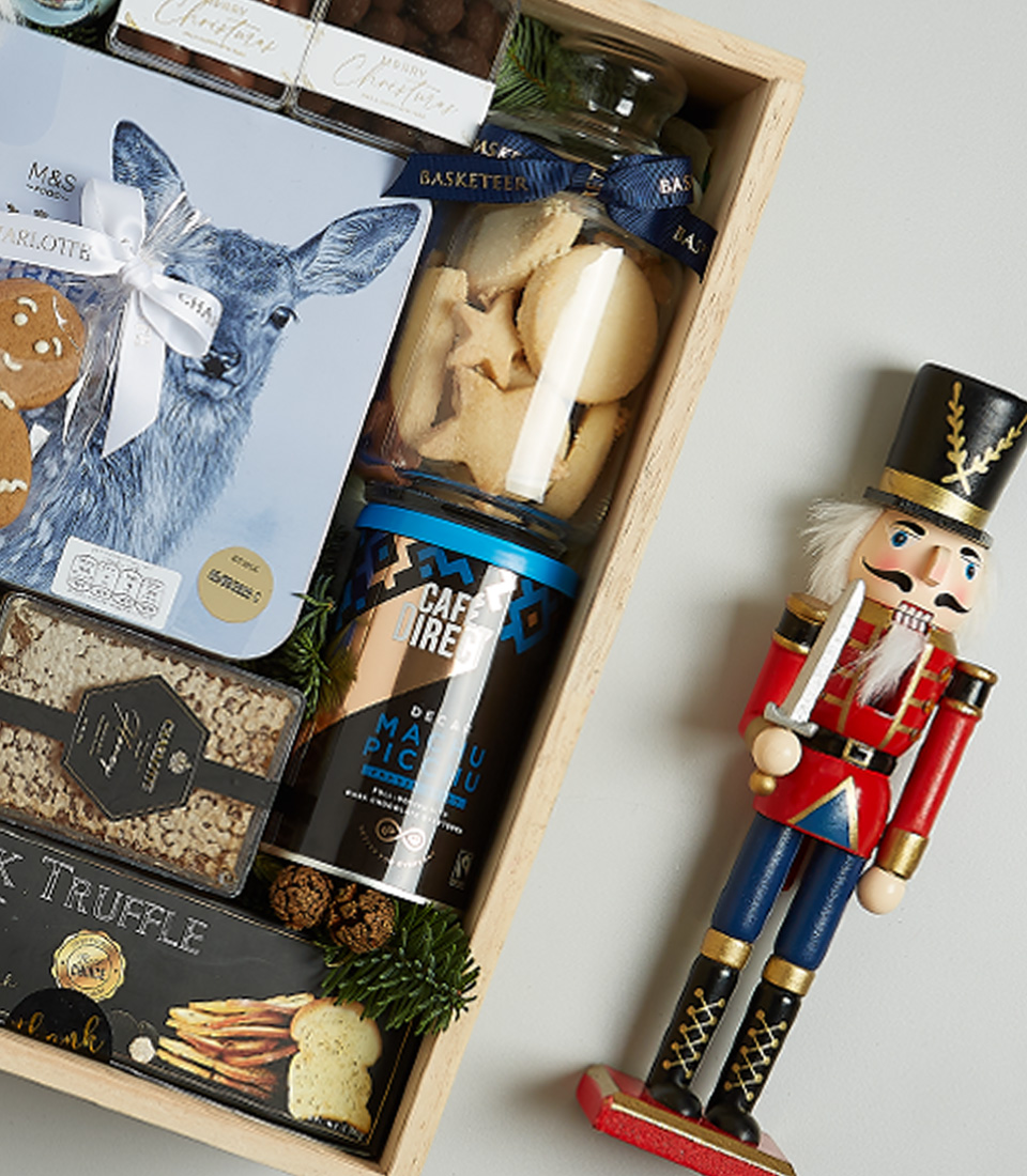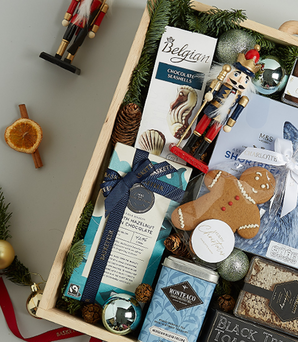 Winter Luxe Indulgence Hamper Elevate holiday gifting with the Winter Luxe Indulgence Hamper. This exquisite selection includes Belgian chocolate thins, gourmet shortbread, premium black truffle crisps, Silver Moon tea, chocolate-covered nuts, and a festive gingerbread cookie. Beautifully arranged in an elegant wooden box adorned with nutcrackers and holiday decor, it’s the ultimate gift for a luxurious Christmas celebration.