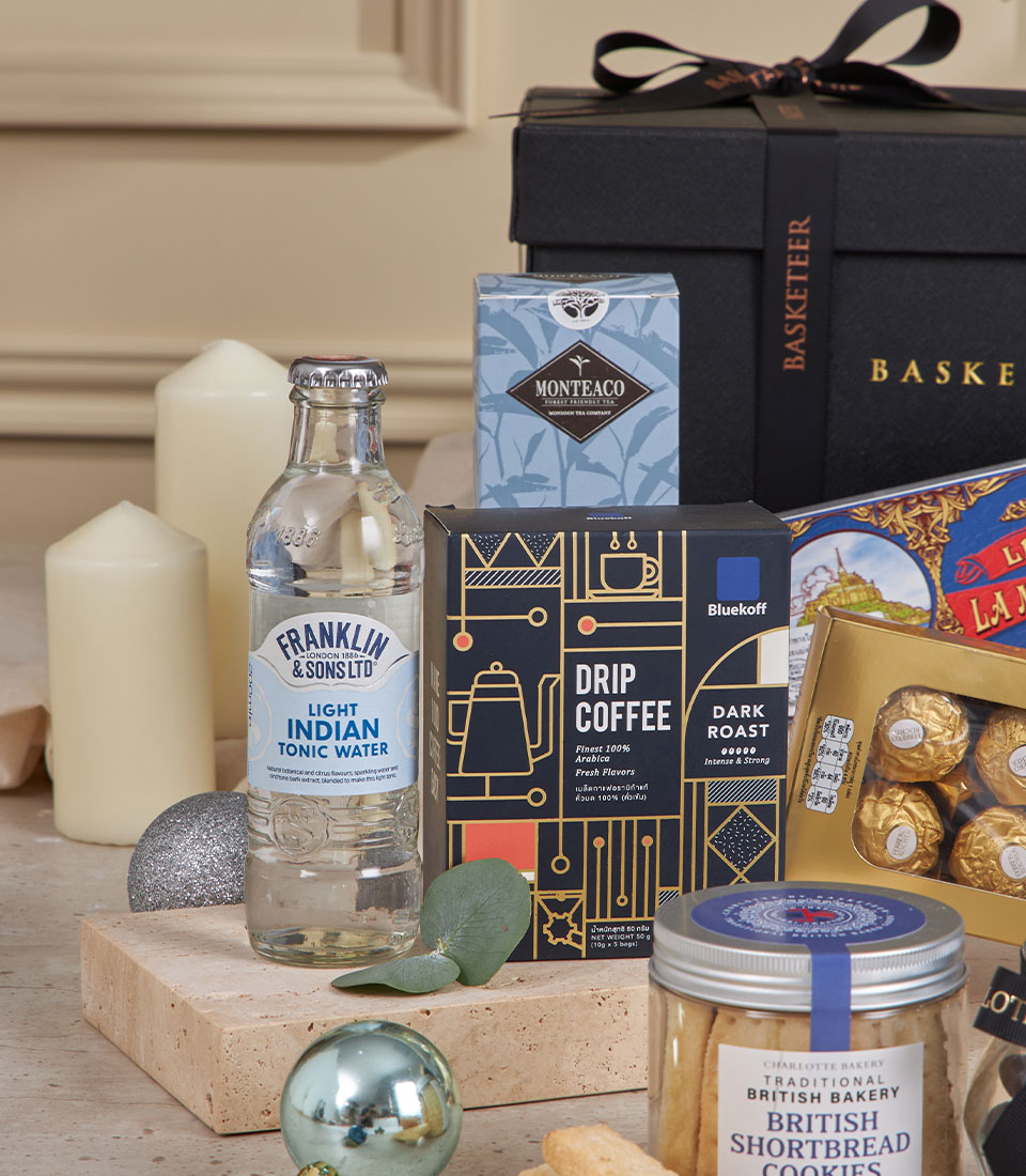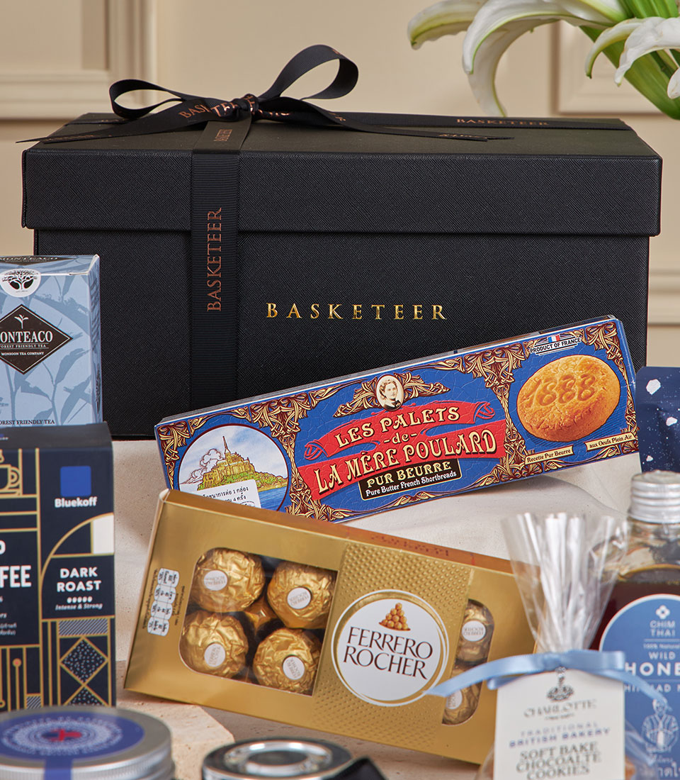 Midnight Blue Gourmet Delight Hamper A sophisticated midnight-blue gourmet hamper filled with fine teas, drip coffee, artisanal shortbread, premium chocolates, nutty treats and pure wild honey. Presented in Basketeer’s elegant black signature box, this refined selection brings modern luxury, warmth and indulgence — perfect for New Year gifting, corporate celebrations and premium occasions in Bangkok.