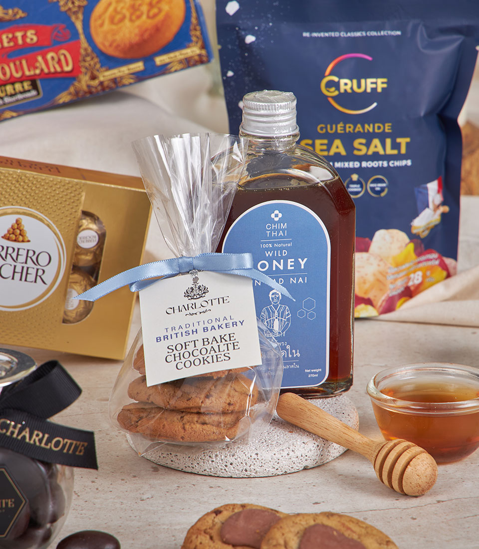 A classic blue-tone gourmet hamper featuring chocolates, cookies, honey, tea and savoury snacks.