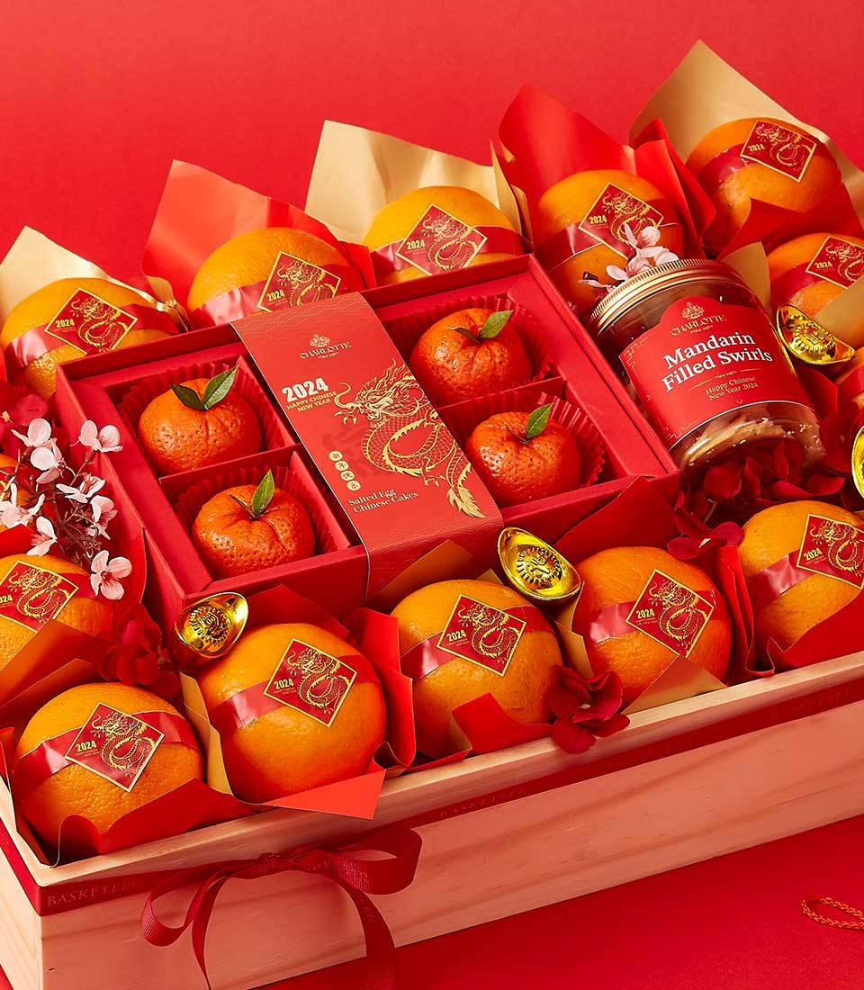 CNY : Zenith of Lunar Citrus Delights Gift Celebrate the Chinese New Year with our elegant wooden gift box, featuring nine vibrant Dekapong oranges wrapped in red paper with gold accents. The box is beautifully decorated with a red ribbon and a "Happy Chinese New Year" message, offering a thoughtful and festive gift. Perfect for spreading good fortune and joy during the celebration!