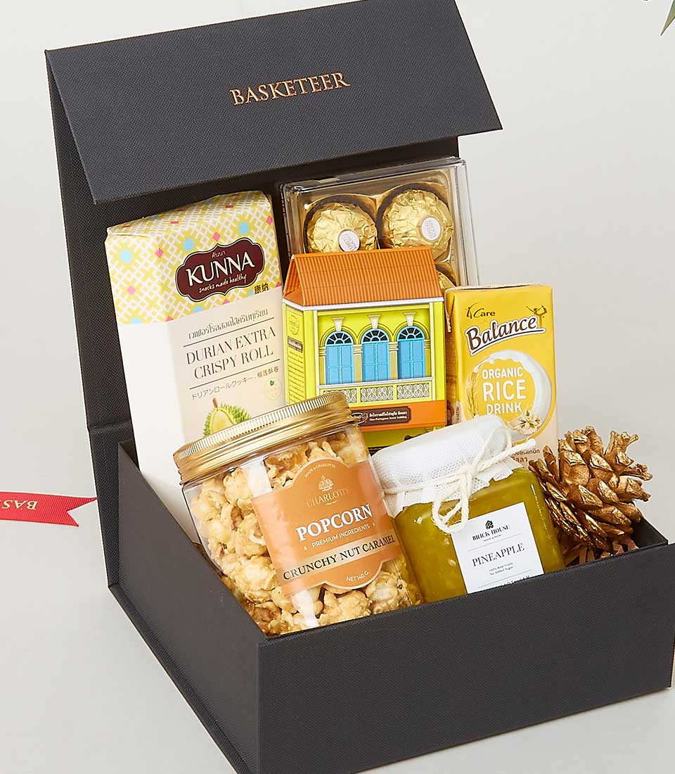Delectable Pairings Gift Box Presenting the Elegant Black Gift Box, a refined selection of gourmet treats beautifully arranged in a sophisticated black box. Perfect for any occasion, this luxurious gift box is designed to impress and delight your recipients, whether they are friends, family, or business associates.