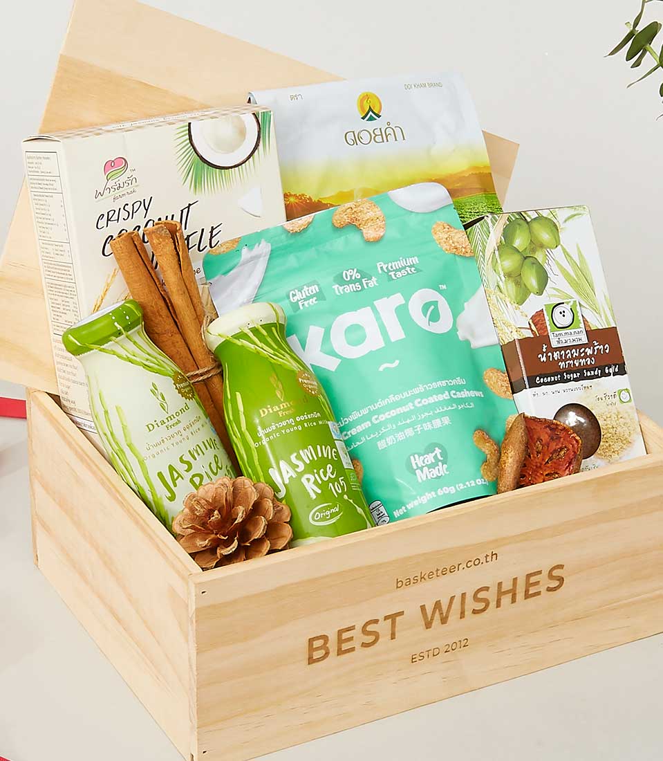Deluxe Gourmet Fare in Timber Box Introducing the Premium Health Gift Box, a thoughtfully curated selection of nutritious and delicious items presented in a stylish wooden box. Ideal for health-conscious recipients, this gift box is perfect for any occasion, offering a mix of snacks and beverages that promote well-being and satisfaction.