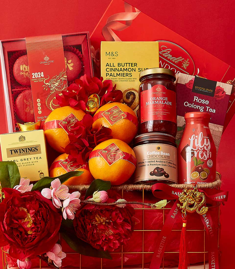 CNY : Eternal Happiness Gift Basket Celebrate the Lunar New Year with our luxurious Prosperity Elegance Gift Basket. Filled with fresh mandarins for good luck and an assortment of indulgent treats like Lindt chocolates cinnamon palmiers rose oolong tea and aromatic coffee beans. This elegant basket adorned with red florals and a golden dragon tassel is the perfect gift to share festive cheer and best wishes with loved ones or business associates.