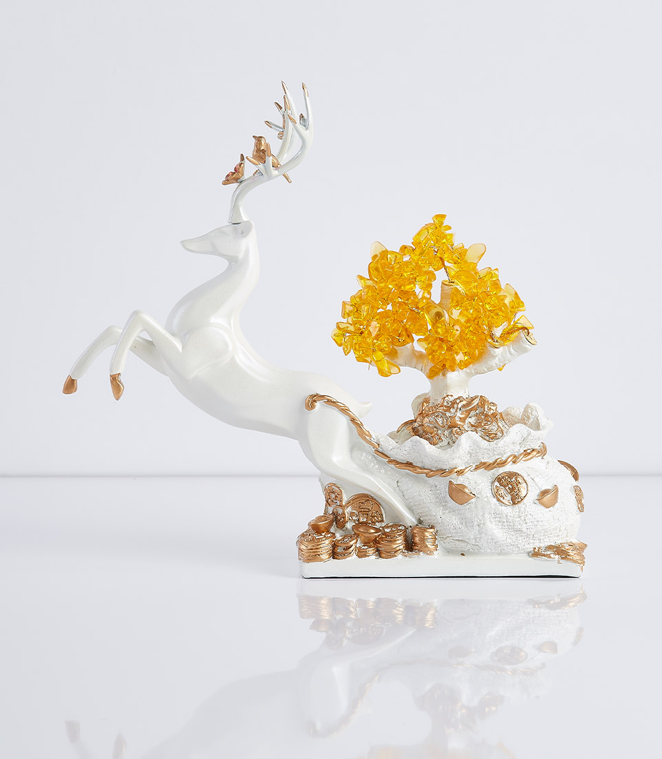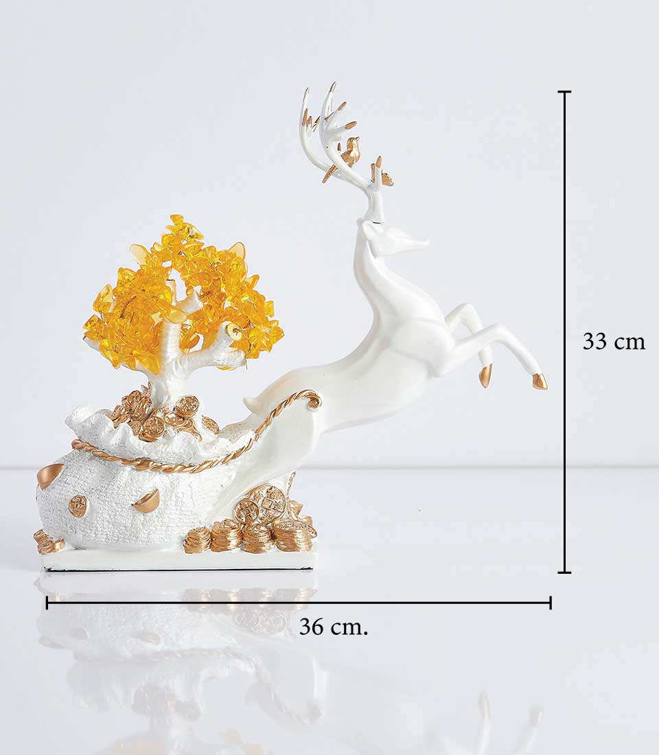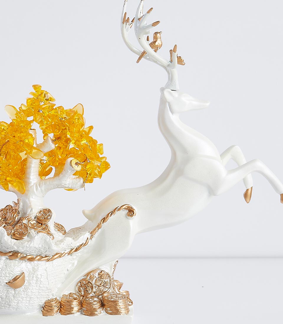 Feng Shui Lucky Deer Money Tree Enhance your space with the "Prosperity Reindeer Figurine" featuring a reindeer pulling a sleigh filled with gold coins and a flourishing money tree. This charming piece symbolizes wealth and good fortune, making it an ideal gift for a new home or office. Believed to bring prosperity and positive energy, it adds a touch of elegance and abundance to any setting.