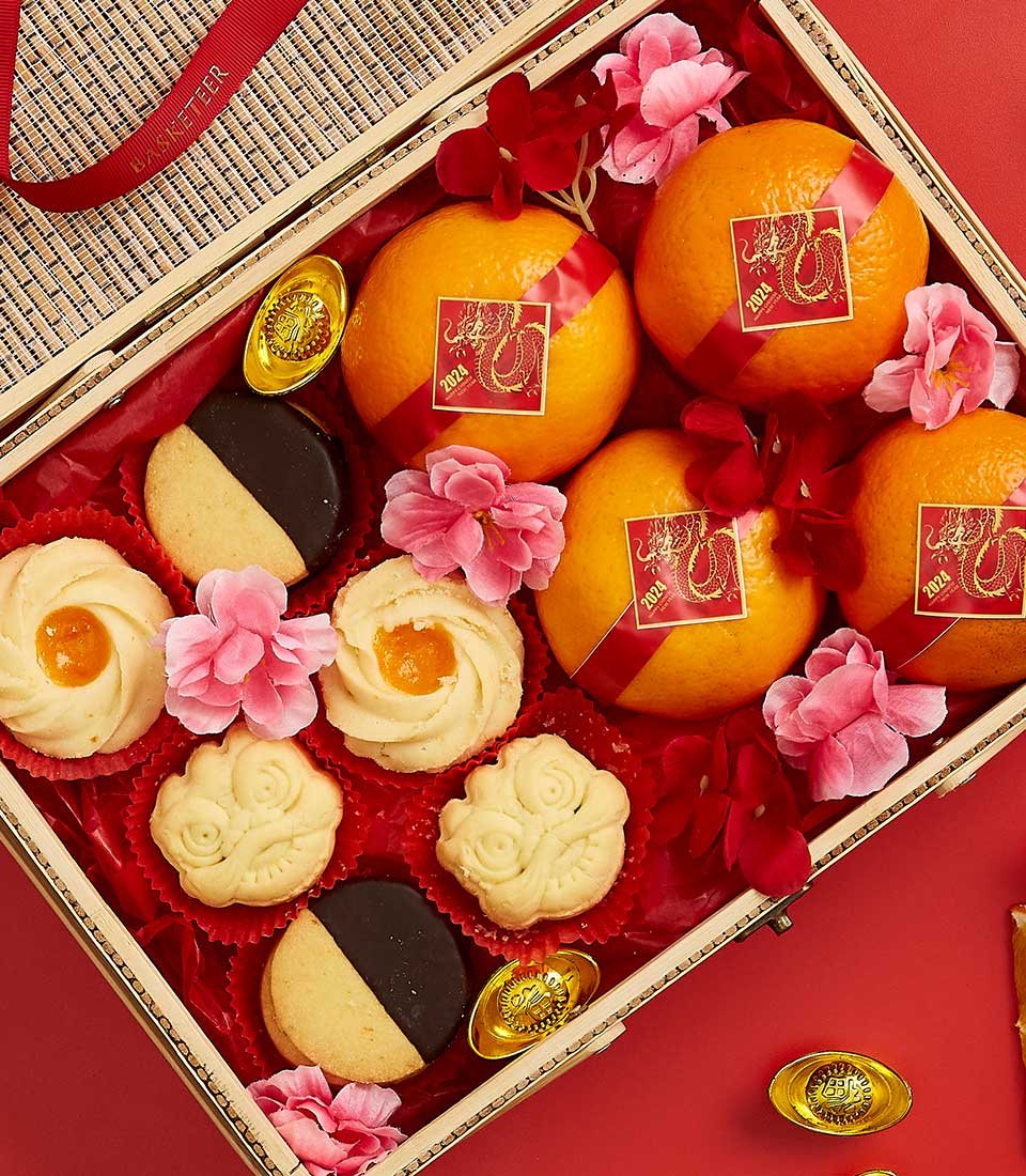 CNY : Harmony Mandarin & Sweets Gift Celebrate Lunar New Year with a beautifully crafted gift box featuring fresh mandarins festive cookies and golden ingots. Thoughtfully designed to symbolize luck joy and prosperity it is the perfect way to share blessings with your loved ones.