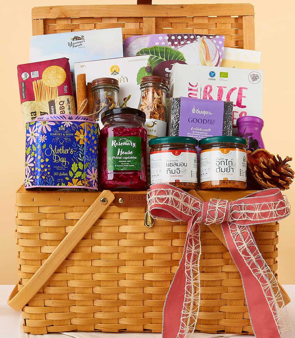 Gastronomic Wellness Journey Hamper Celebrate Day with the exquisite Gourmet Hamper, thoughtfully curated to bring joy and delight to your beloved. This beautiful wicker basket, adorned with a charming pink ribbon, is filled with a selection of gourmet treats and premium snacks that are sure to make her day extra special.