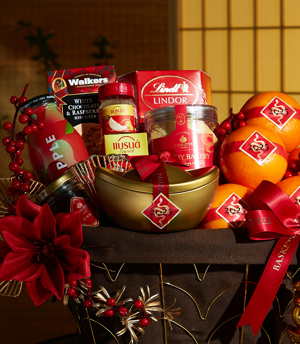 Golden Harmony Chinese New Year Gift Basket Celebrate Chinese New Year with a premium basket featuring vibrant oranges, elegant golden accents, and festive treats. Perfect for sharing joy and prosperity.