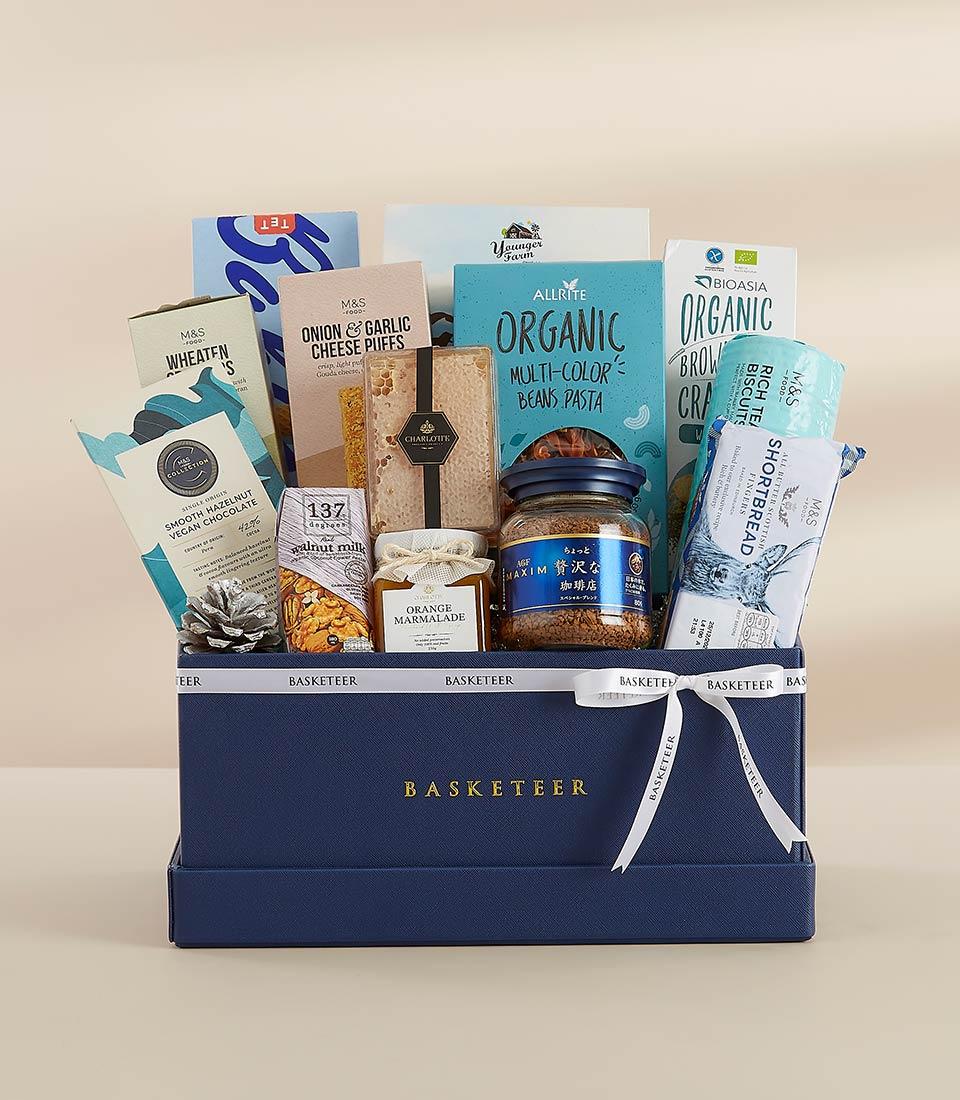 Gourmet Treats Gift Hamper Enjoy a curated selection of organic treats in this luxurious gift hamper. From multi-color bean pasta to organic crackers, cheese puffs, orange marmalade, and more, this hamper makes the perfect gift for any occasion.
