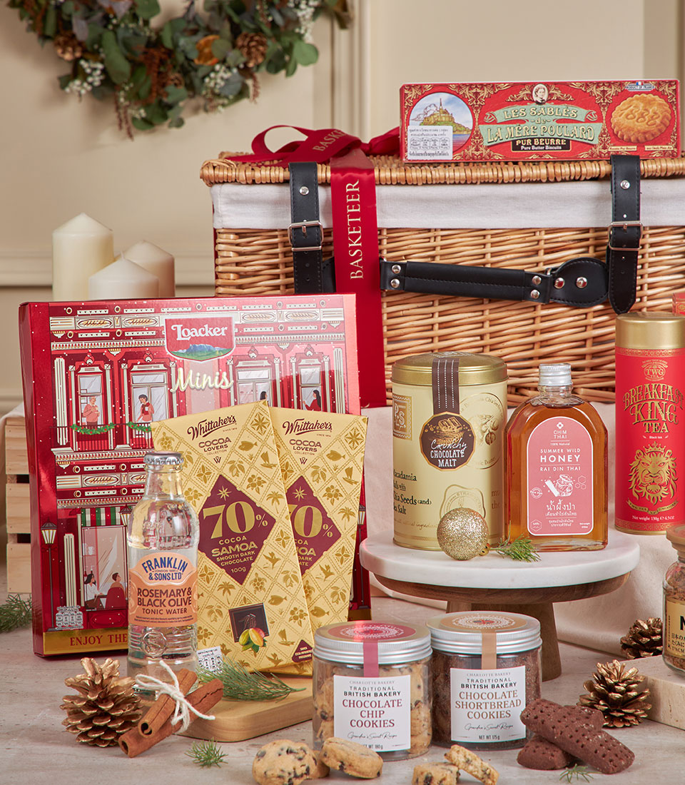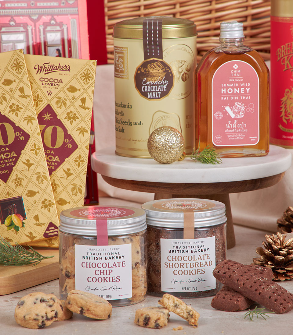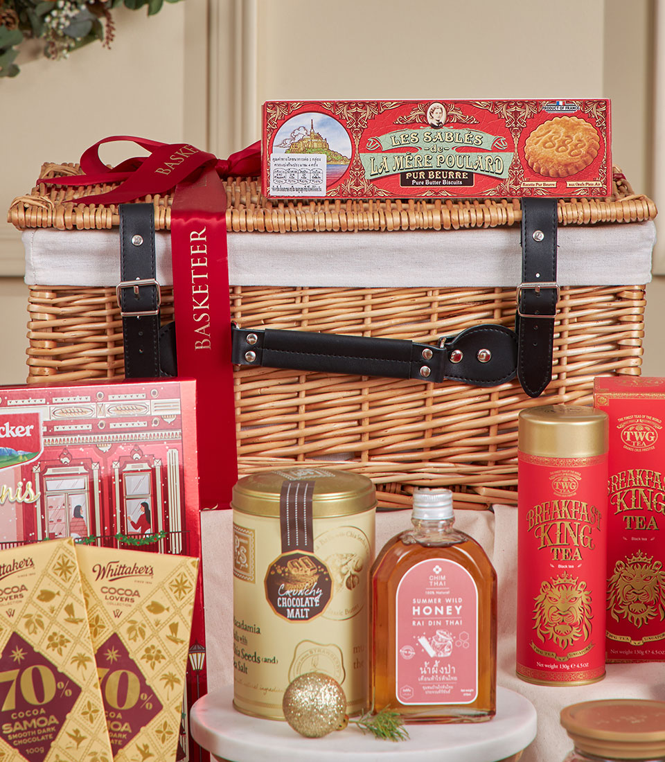Royal Red Grandeur Celebration Hamper A majestic red-and-gold festive hamper generously filled with artisan biscuits, gourmet chocolates, premium tea, honey, nutty delights and non-alcoholic wine. Designed in Basketeer’s luxurious holiday style, this impressive gourmet basket is crafted to deliver warmth, abundance and refined festive cheer — perfect for corporate gifting, New Year celebrations and special occasions in Bangkok.