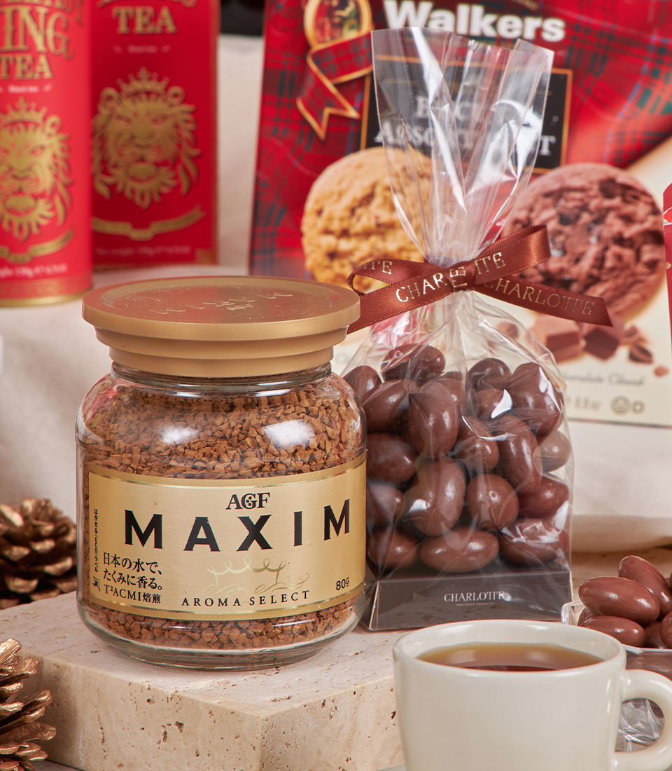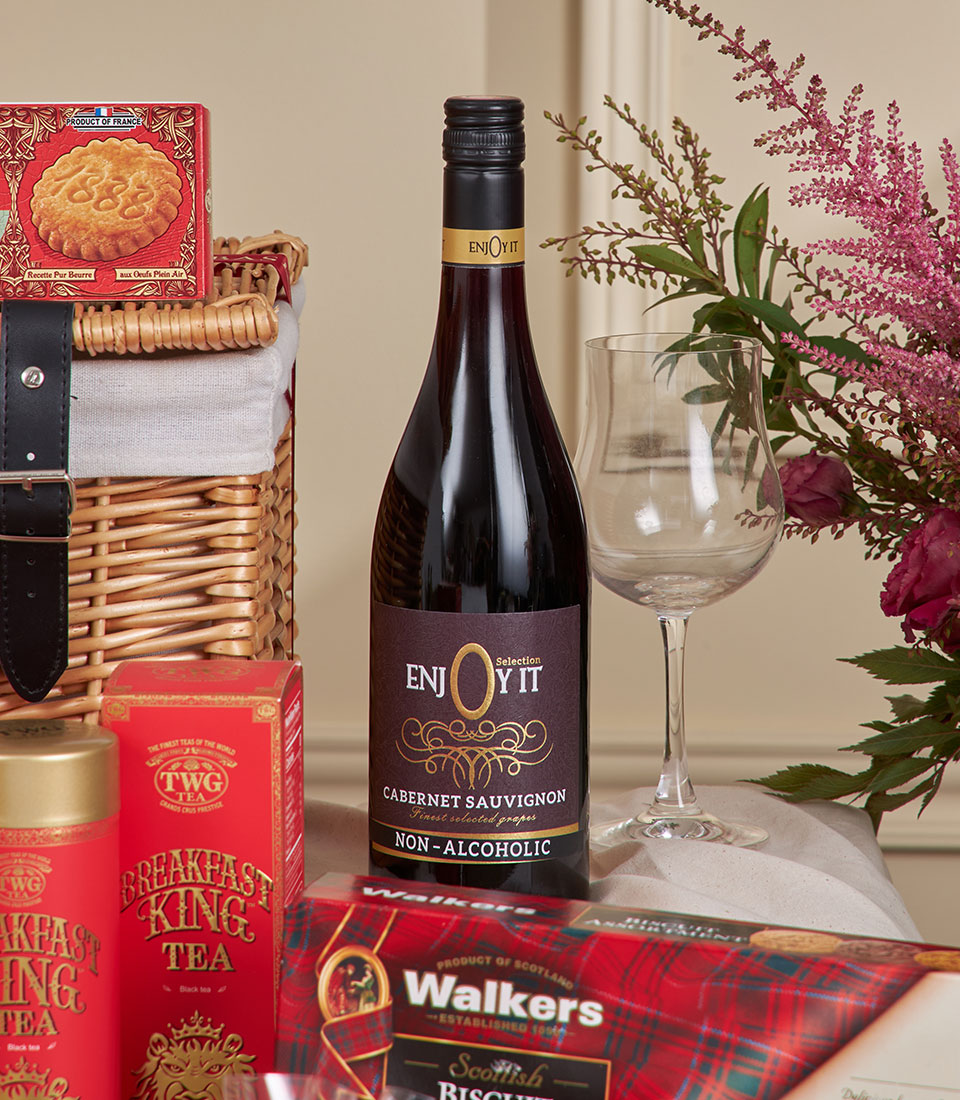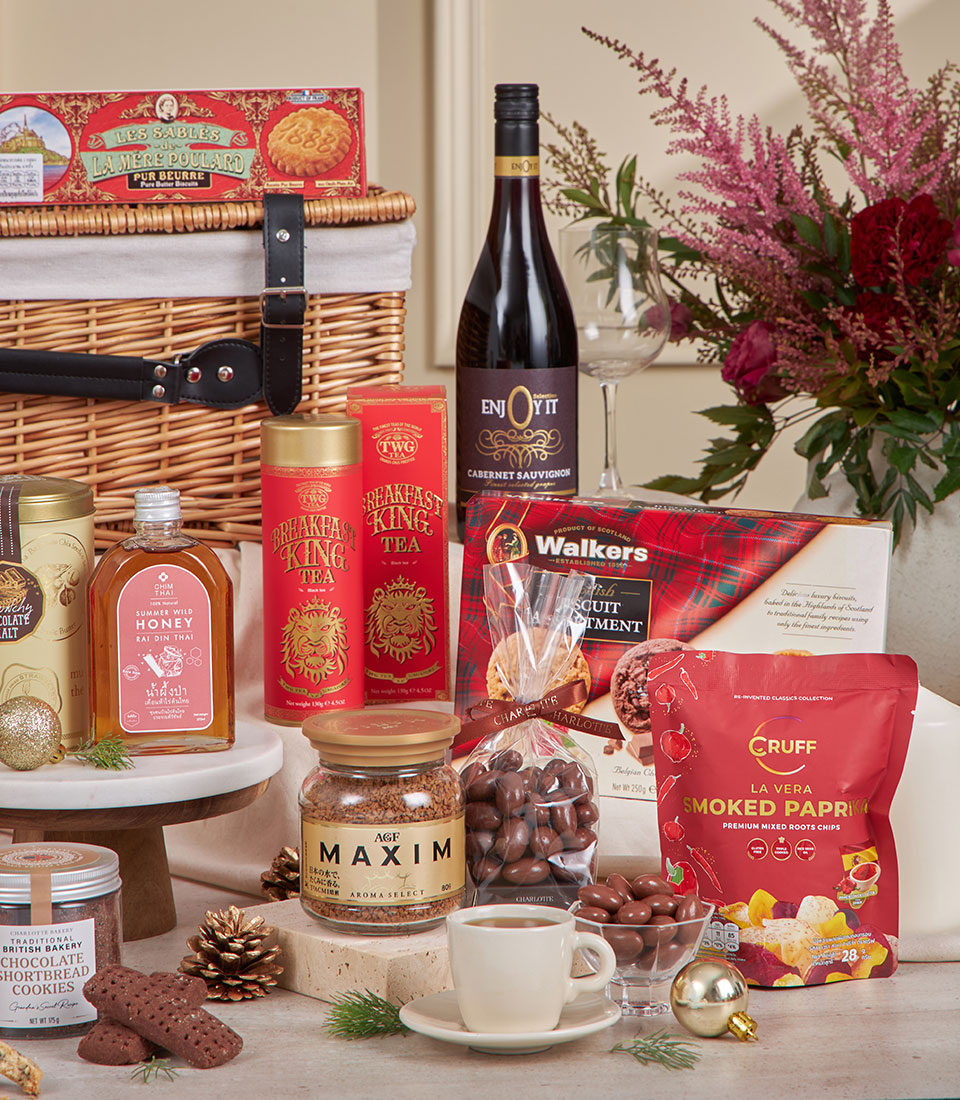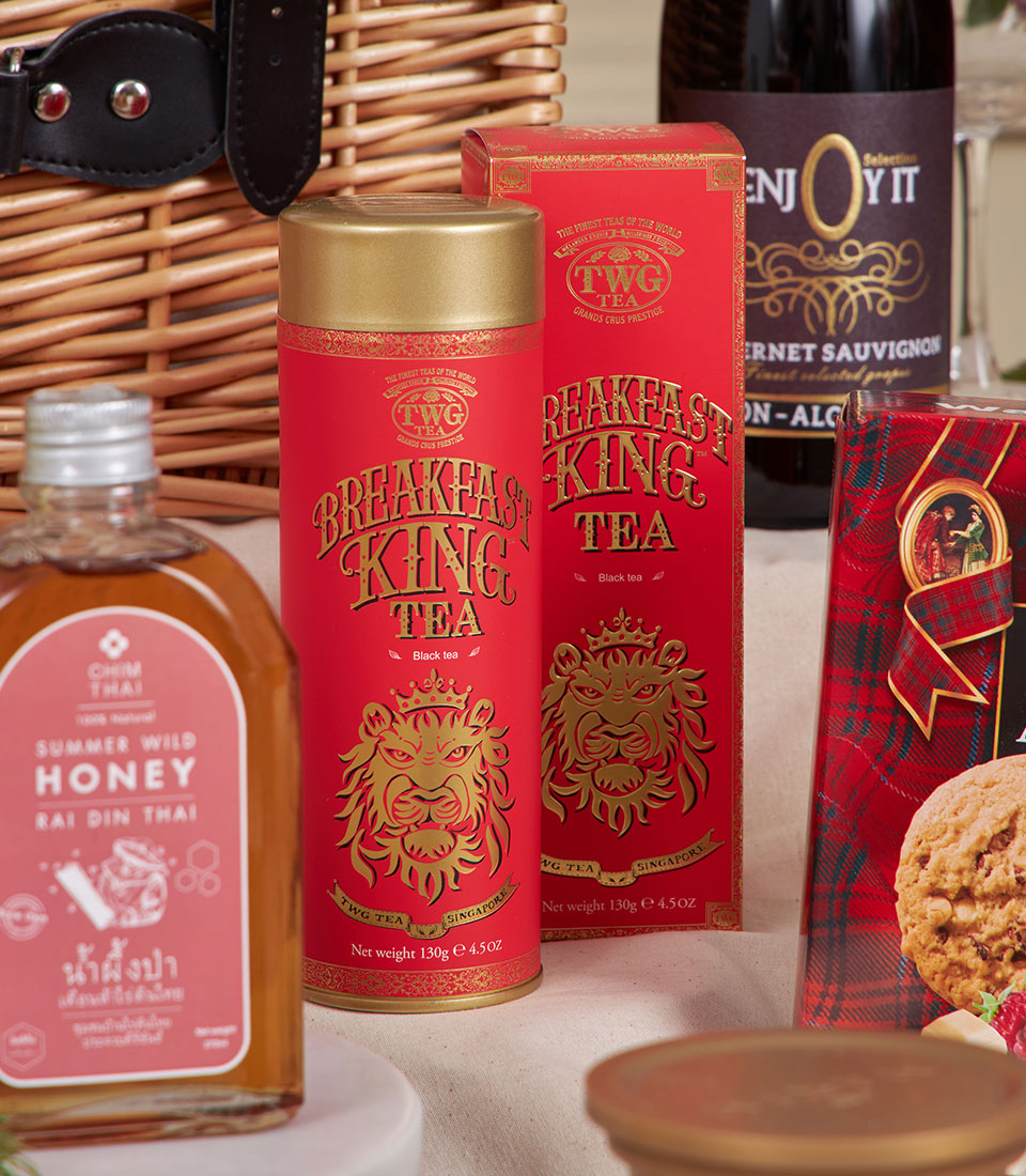 Royal Red Grandeur Celebration Hamper A majestic red-and-gold festive hamper generously filled with artisan biscuits, gourmet chocolates, premium tea, honey, nutty delights and non-alcoholic wine. Designed in Basketeer’s luxurious holiday style, this impressive gourmet basket is crafted to deliver warmth, abundance and refined festive cheer — perfect for corporate gifting, New Year celebrations and special occasions in Bangkok.