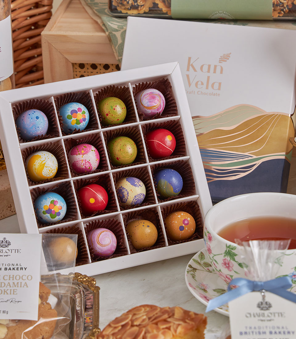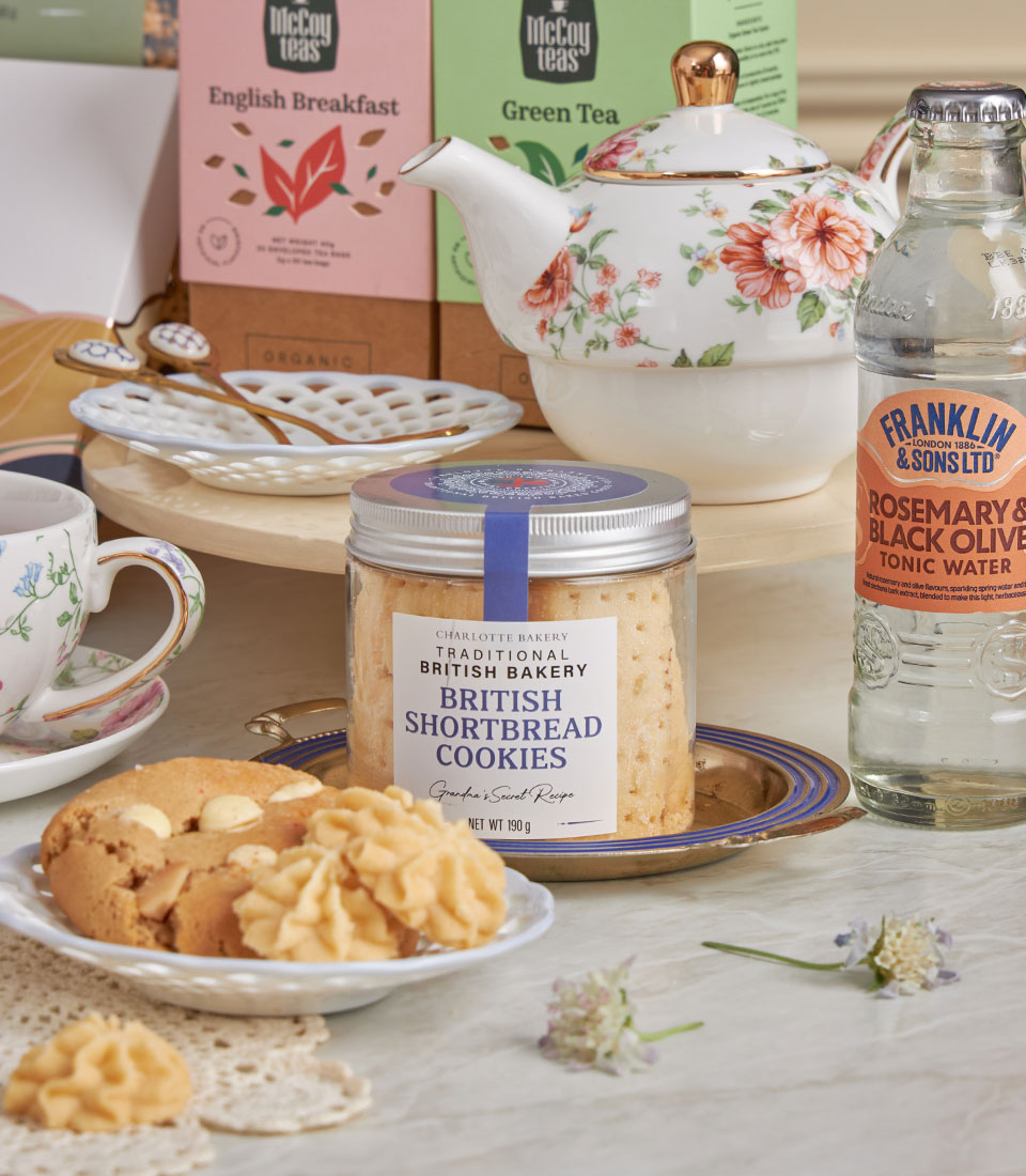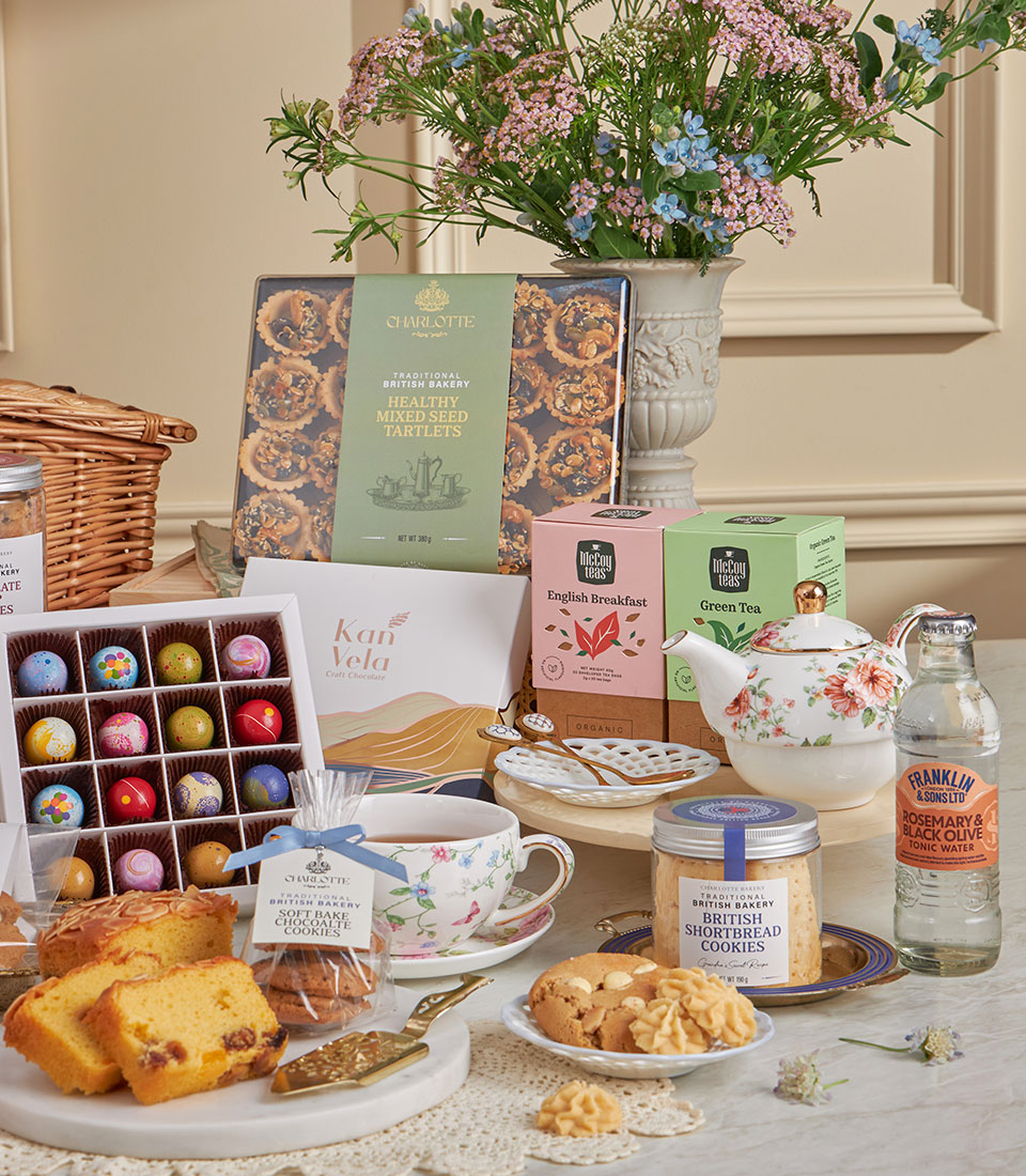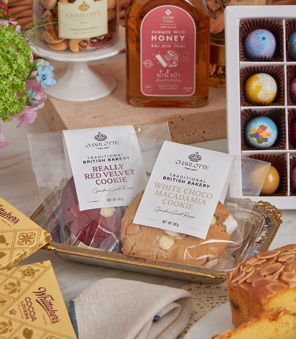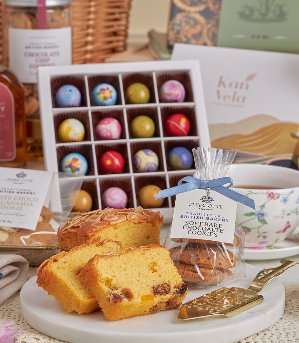 An extravagant high-tea inspired hamper featuring rich cookies, Charlotte cakes, truffle treats and a selection of elegant delicacies — crafted to impress with timeless sophistication.