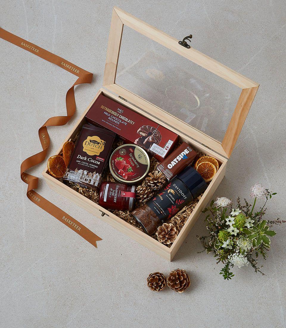 Happy Camper Gift Satisfy chocolate lovers with this Choco Indulgence Treat Box, packed with rich delights including premium dark cocoa powder, luxurious milk chocolate rounds, and a delectable cherry spread. Paired with Davidoff coffee and wholesome oat snacks, this beautifully presented wooden gift box makes for an elegant and irresistible gift.
