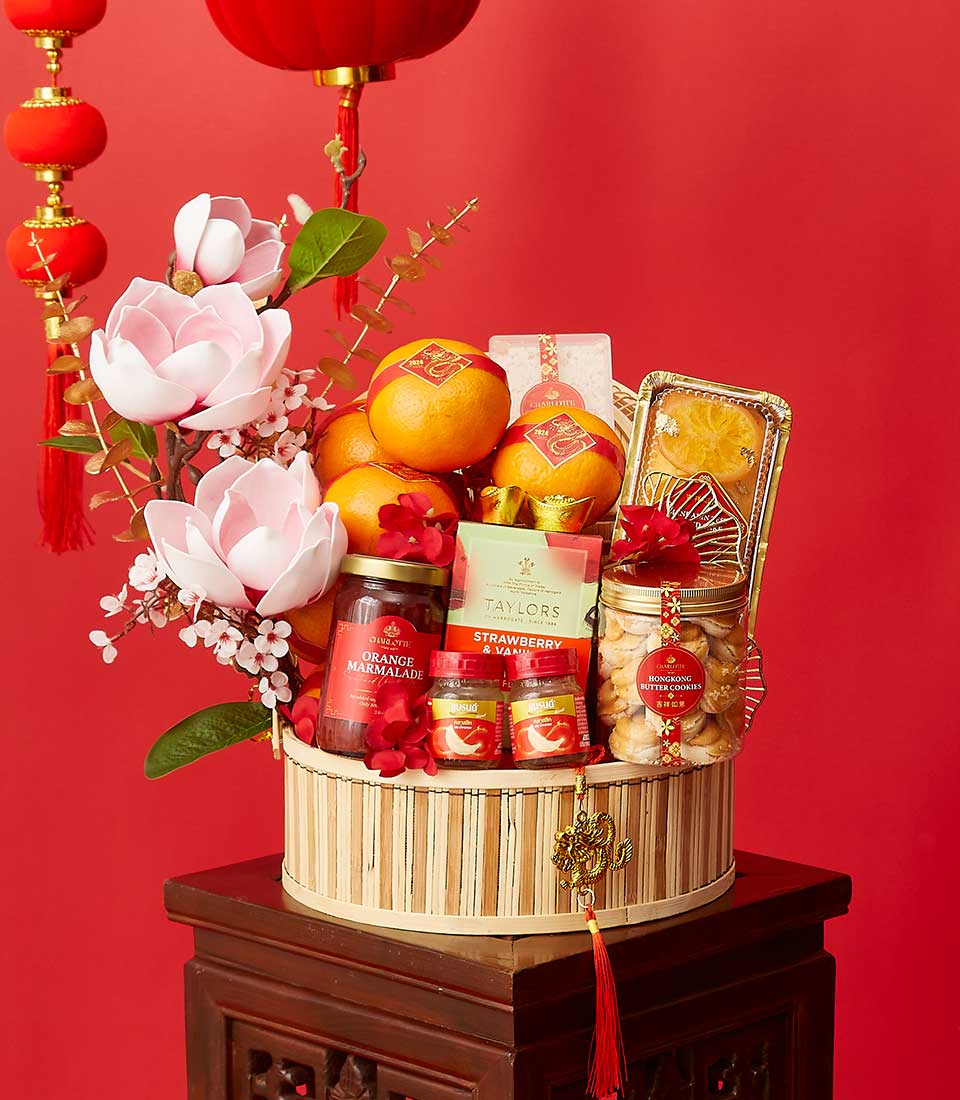 CNY : Happy New Year Indulgence Gift Celebrate the Lunar New Year with the Lunar Blossom Gourmet Basket filled with symbolic oranges, premium teas, cookies, and orange marmalade. Presented in an elegant bamboo-style basket with blooming magnolia flowers and gold accents, it’s the perfect gift for loved ones or corporate giving, bringing prosperity and joy to all.