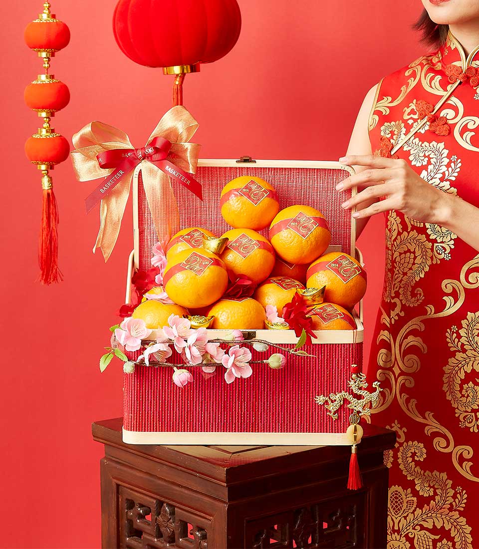 Celebrate Chinese New Year with a luxurious red mandarin basket, featuring fresh fruits, pink blossoms, and gold ribbon accents.