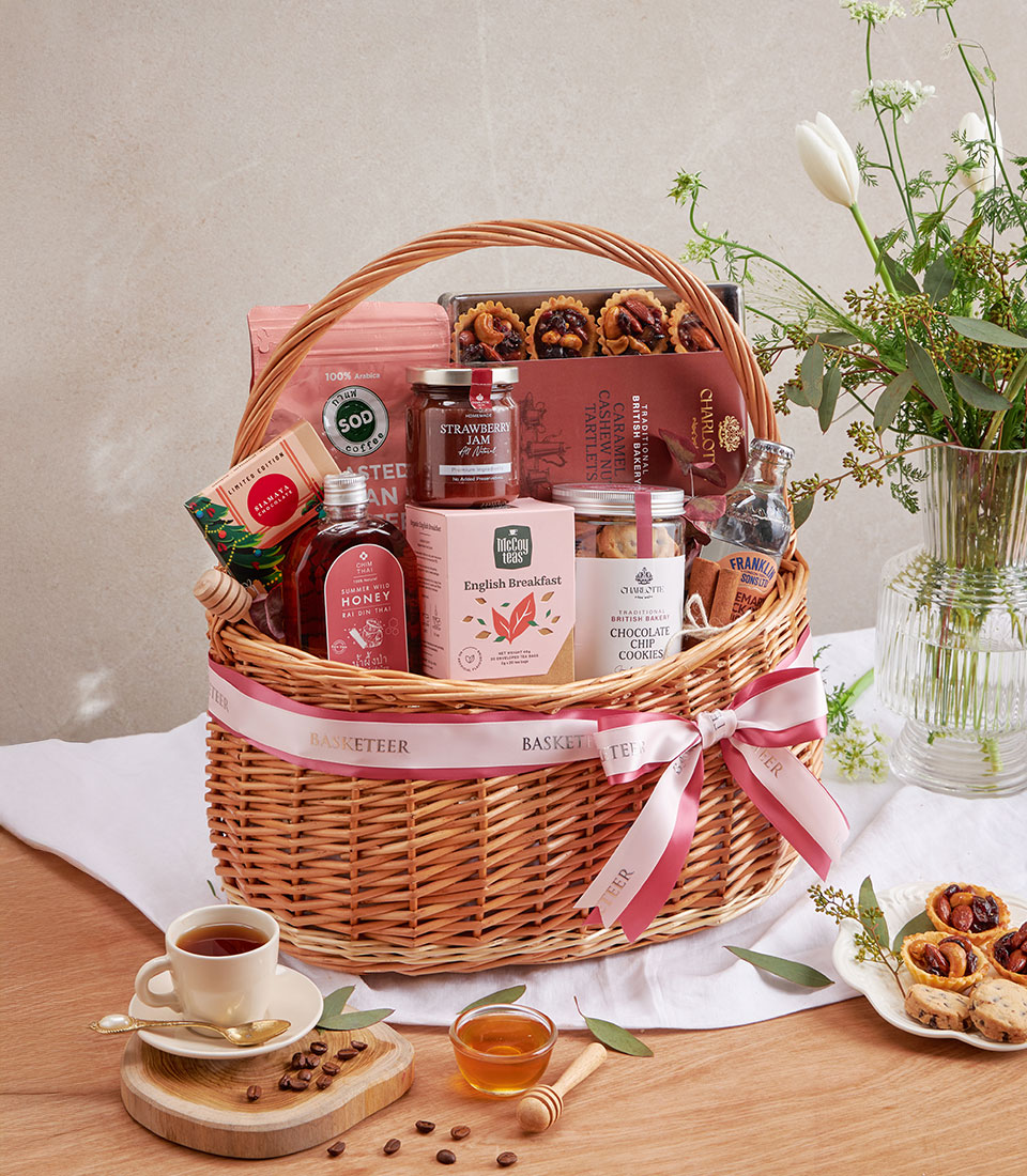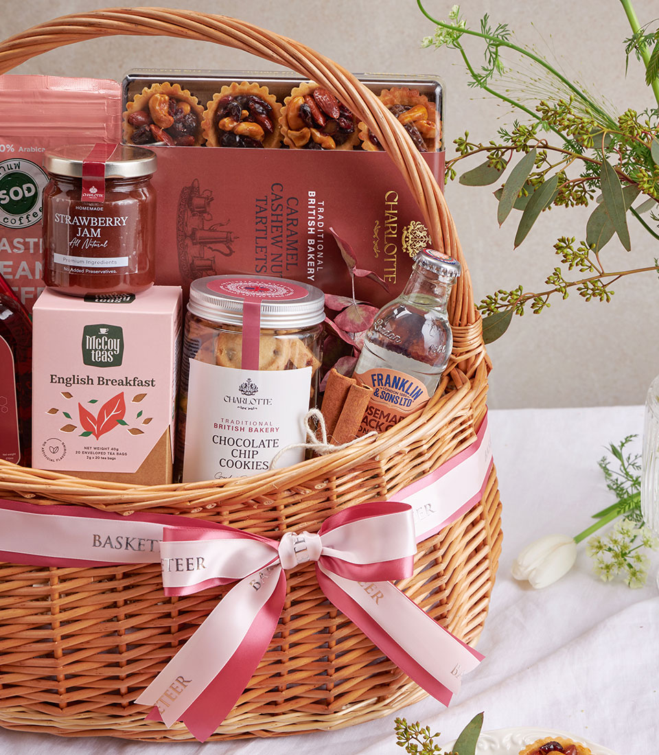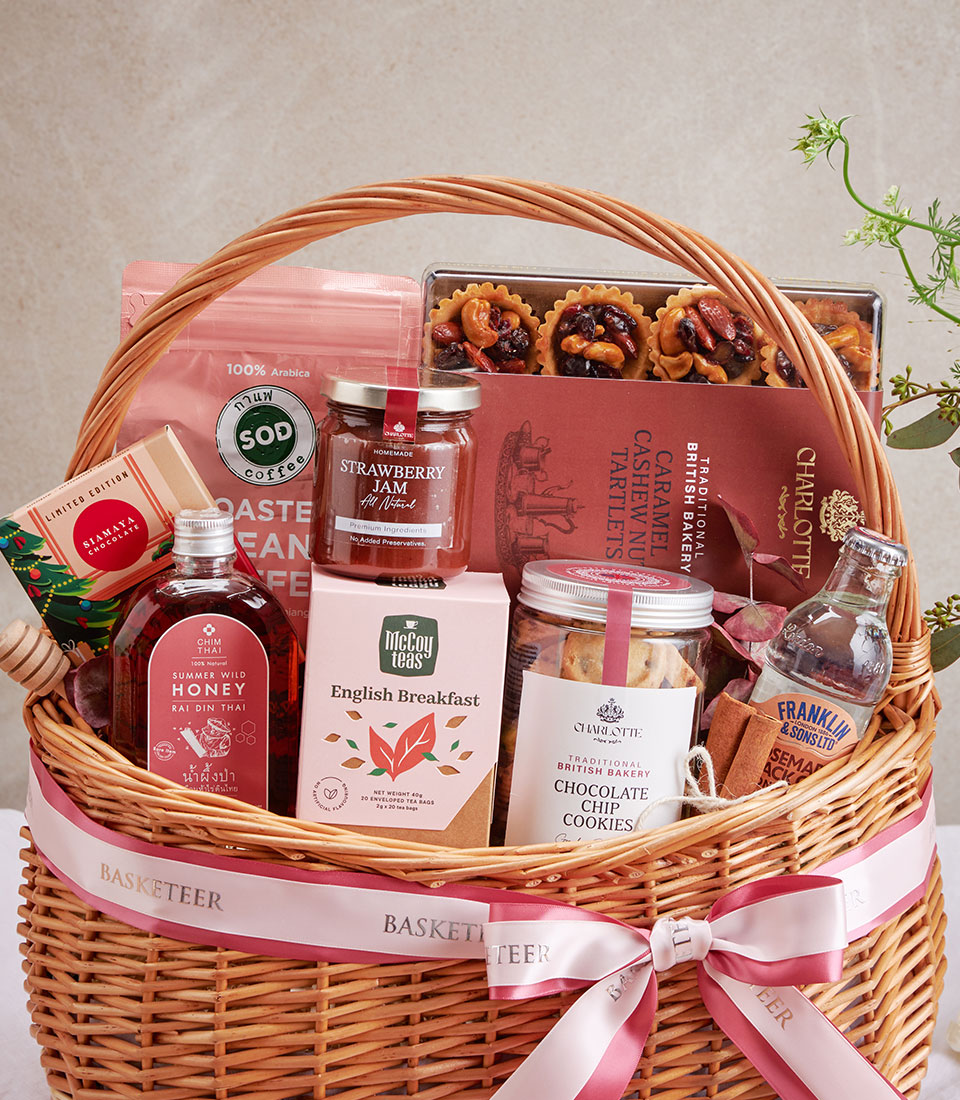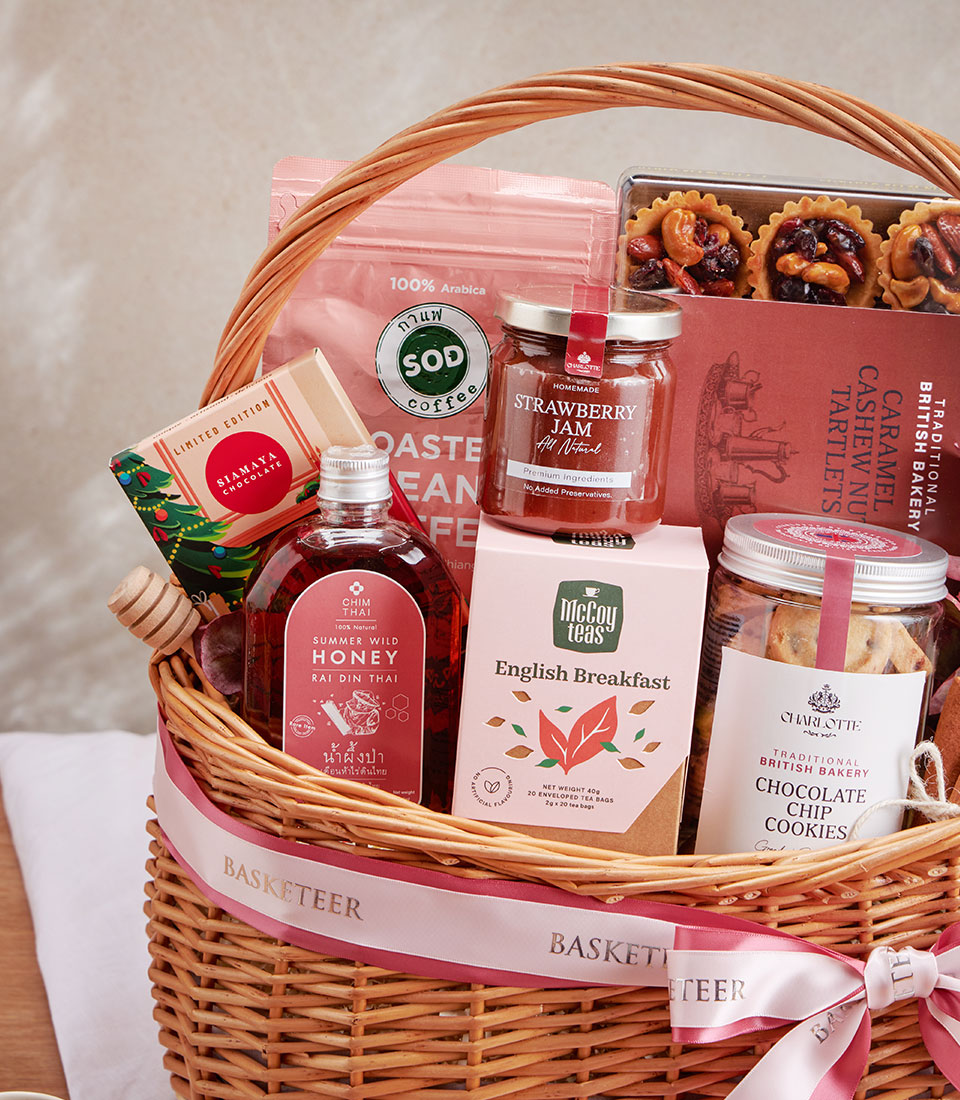 A refined gourmet basket with medium roast coffee beans, tea, honey, jam, caramel tart, craft chocolate and cookies. A warm, elegant gift in Bangkok.