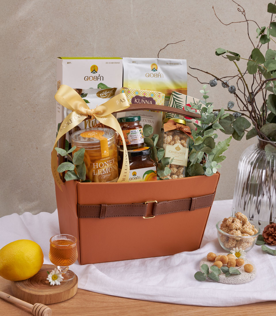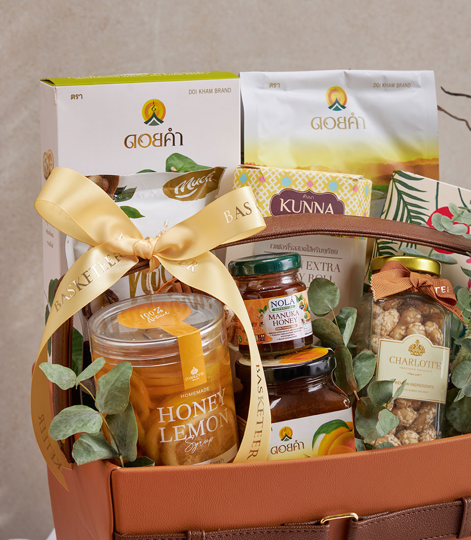 Premium Wellness & Honey Gift Basket A refined collection of nourishing honey selections, wholesome nuts, dark chocolate, and Doi Kham wellness drinks. Crafted for thoughtful gifting, this basket brings warmth, care, and premium quality to every occasion.