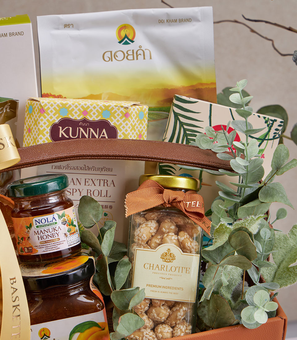 A deluxe wellness hamper featuring Doi Kham dehydrated fruits, soy milk, macadamia nuts, dark chocolate, honey, and more.