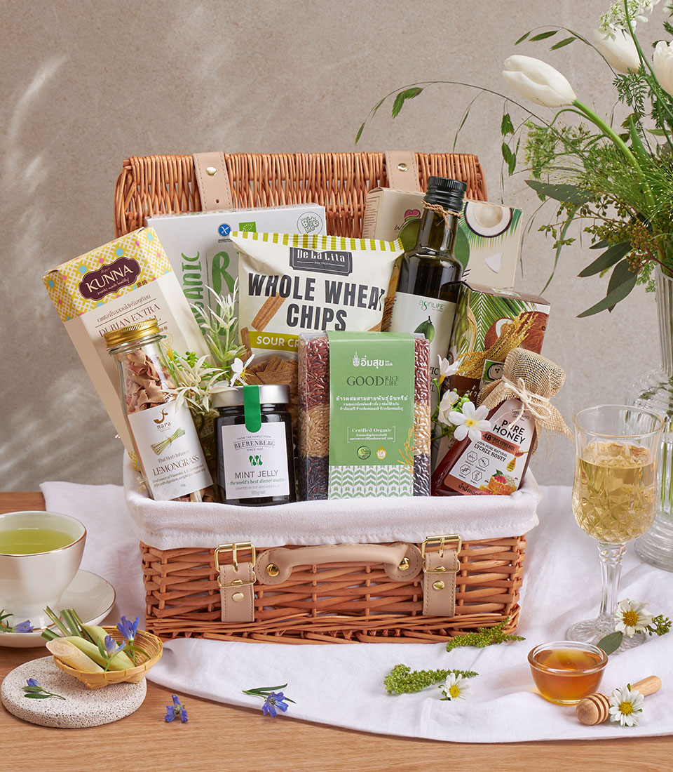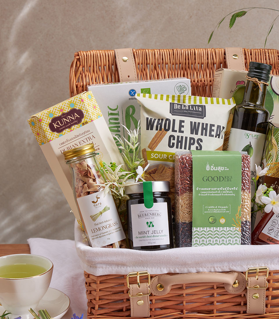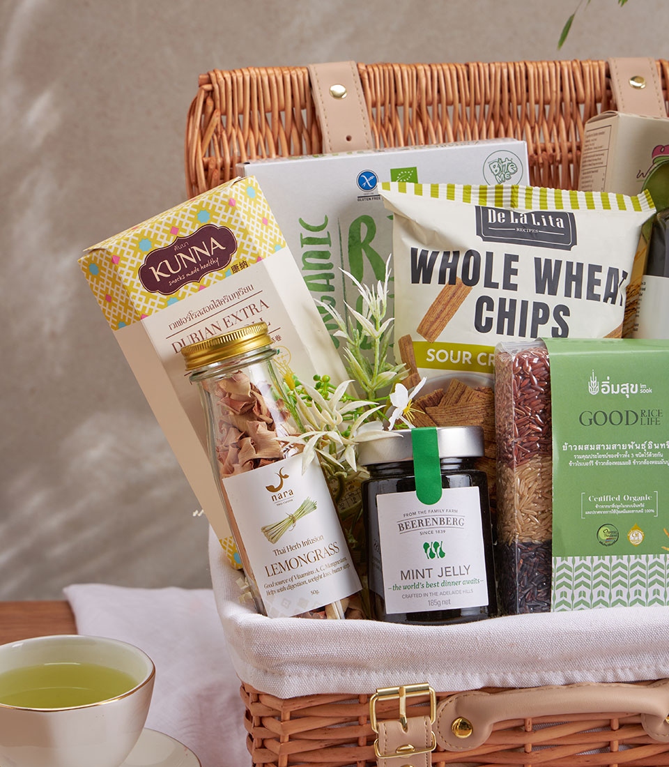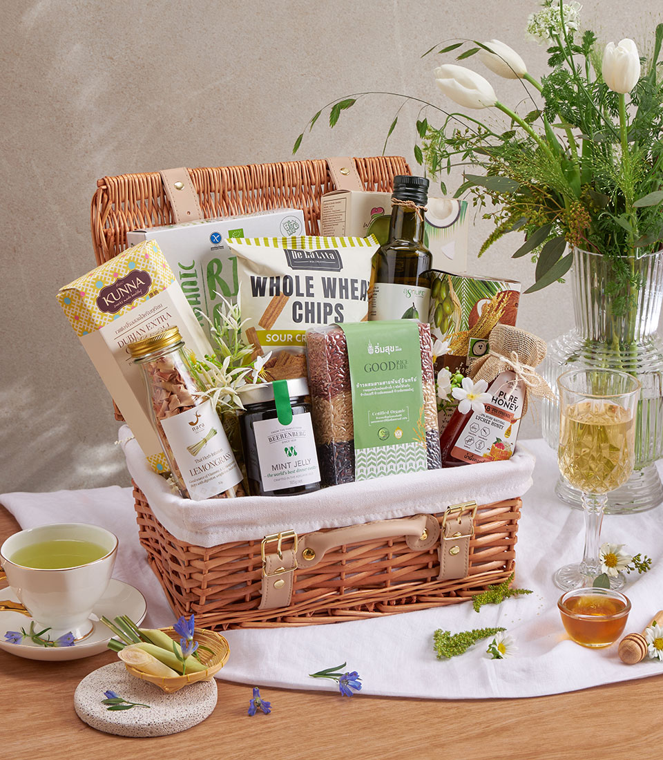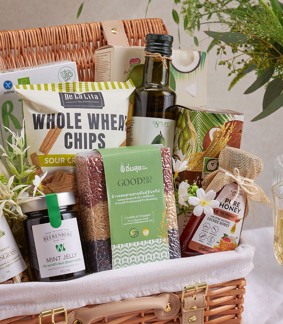 A wellness hamper with organic rice bites, waffles, durian crisps, wheat chips, olive oil, coconut sugar, mint jelly, and honey.