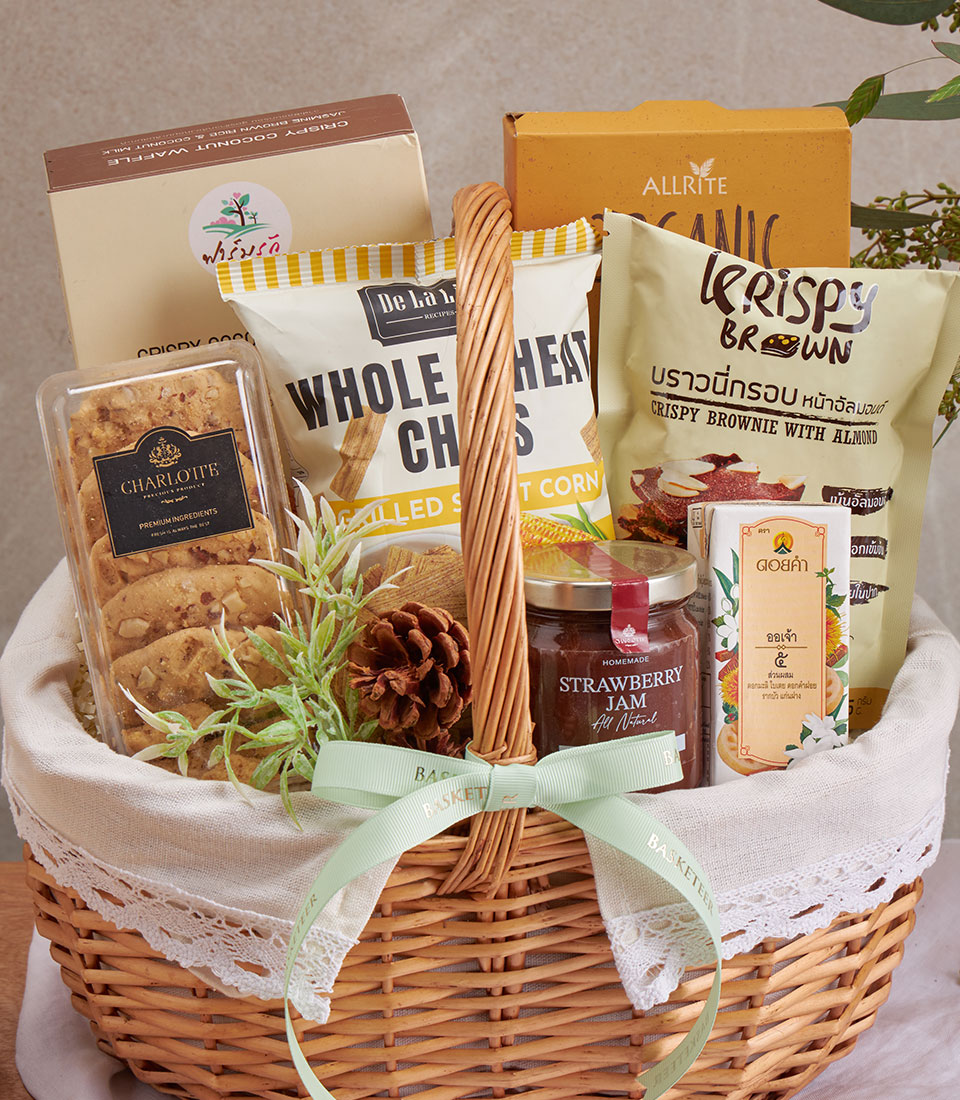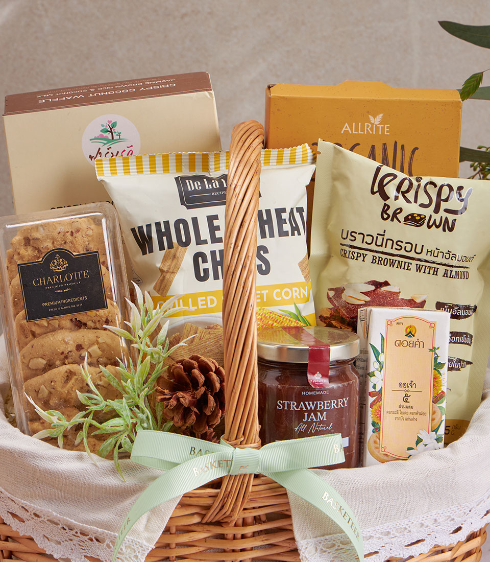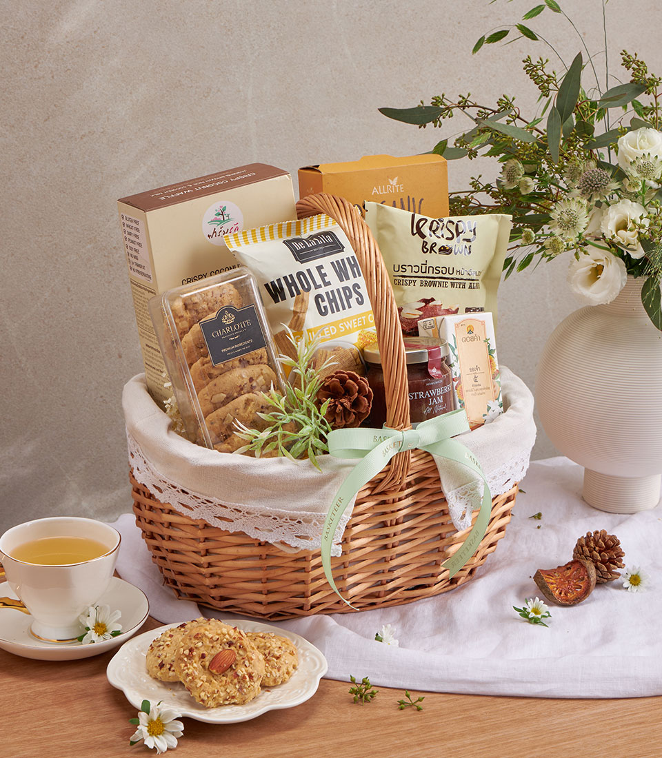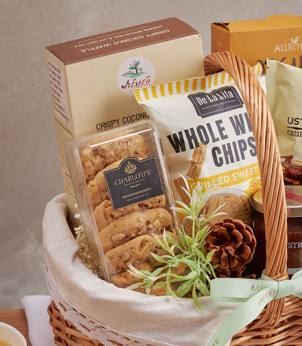 Healthy Granola & Cookies Gift Basket A balanced mix of crunchy waffles, wholesome snacks, cookies, and herbal drinks — a warm, uplifting gift for families, colleagues, and loved ones.