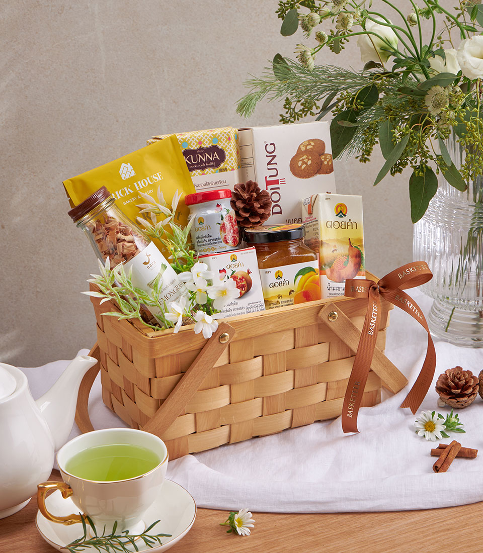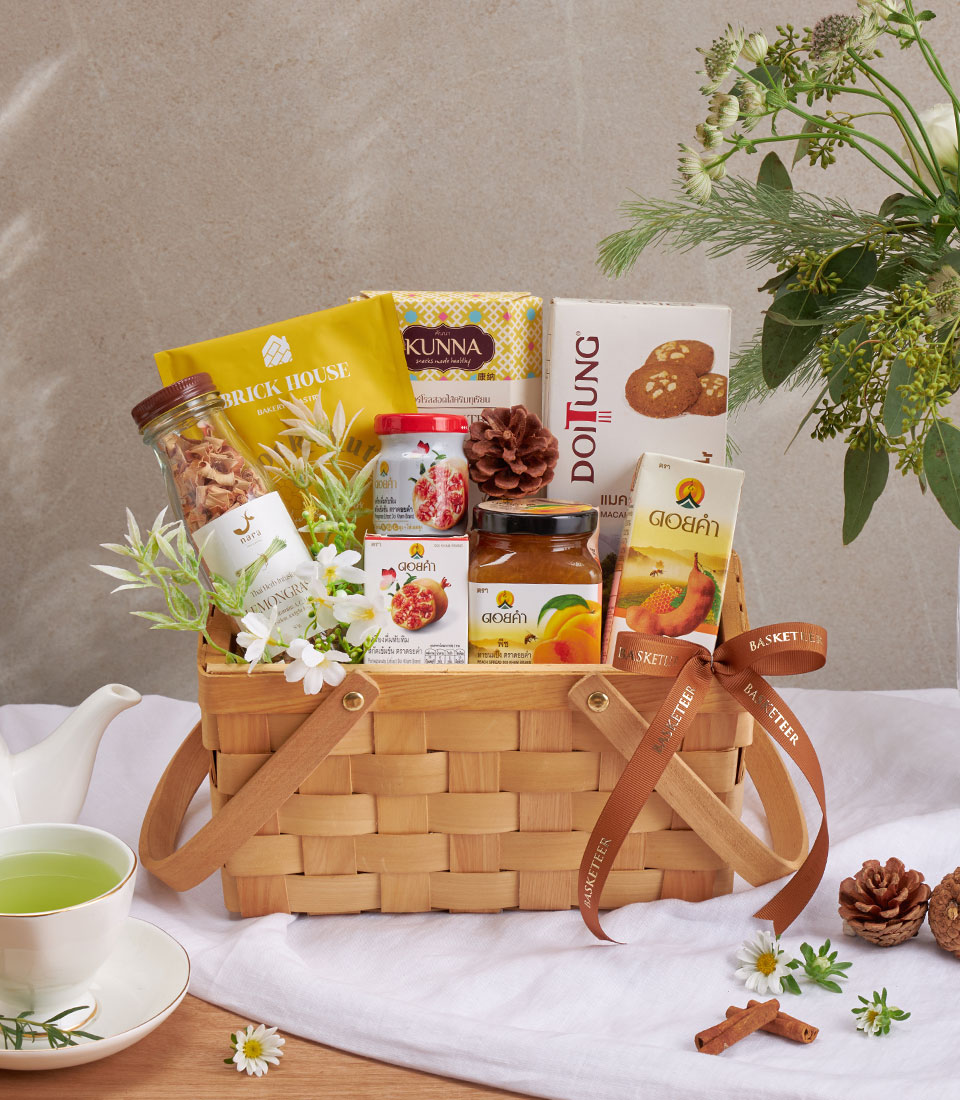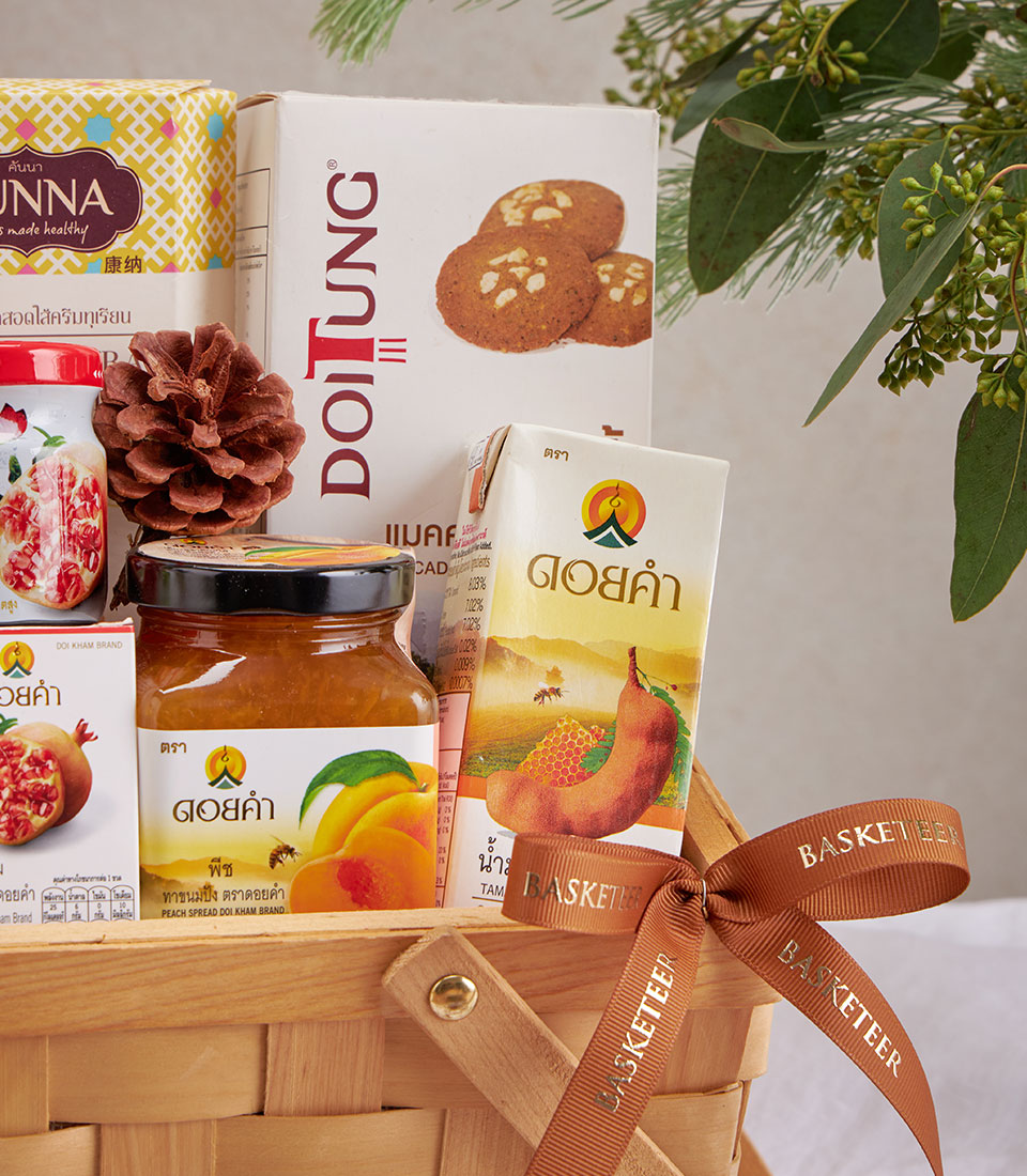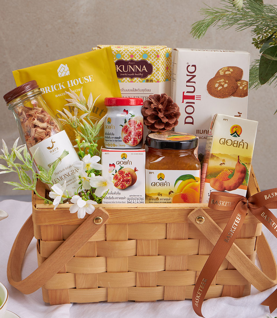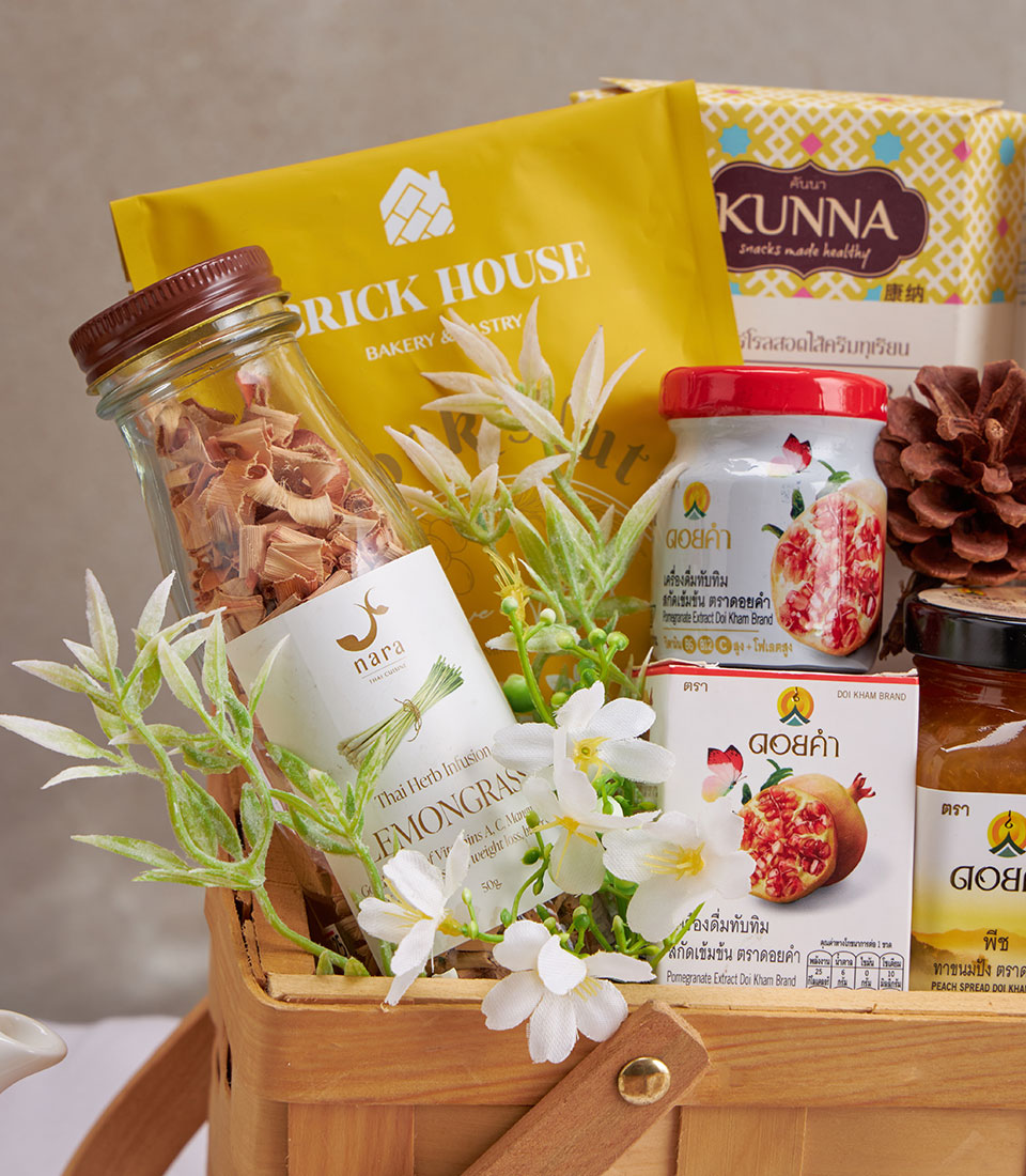 A curated wellness gift basket featuring premium mixed nuts, dried lemongrass, macadamia cookies, fruit spreads, and nourishing Doi Kham drinks. A healthy and versatile hamper suitable for New Year gifting and all special occasions, with same-day delivery in Bangkok.