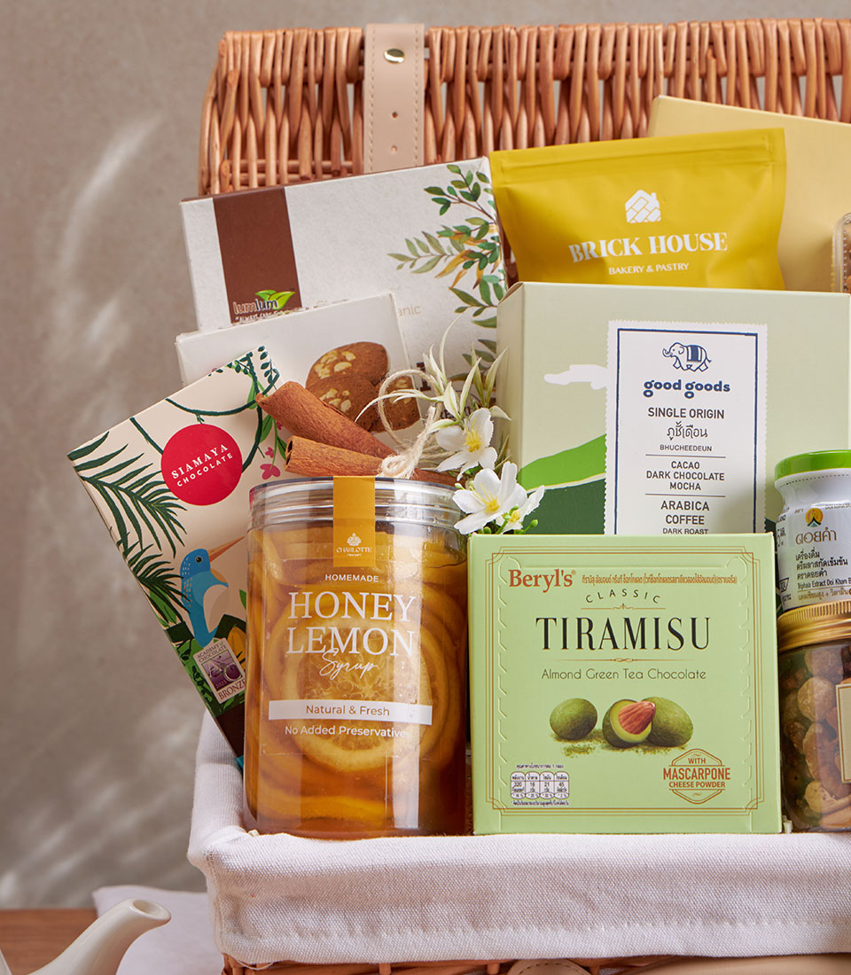 A luxury set with organic Pad Thai, coconut rolls, cookies, coffee, salted caramel nuts, dark chocolate, cider vinegar, tea, honey, tiramisu chocolate, mixed nuts, Triphala, and fruit drops.