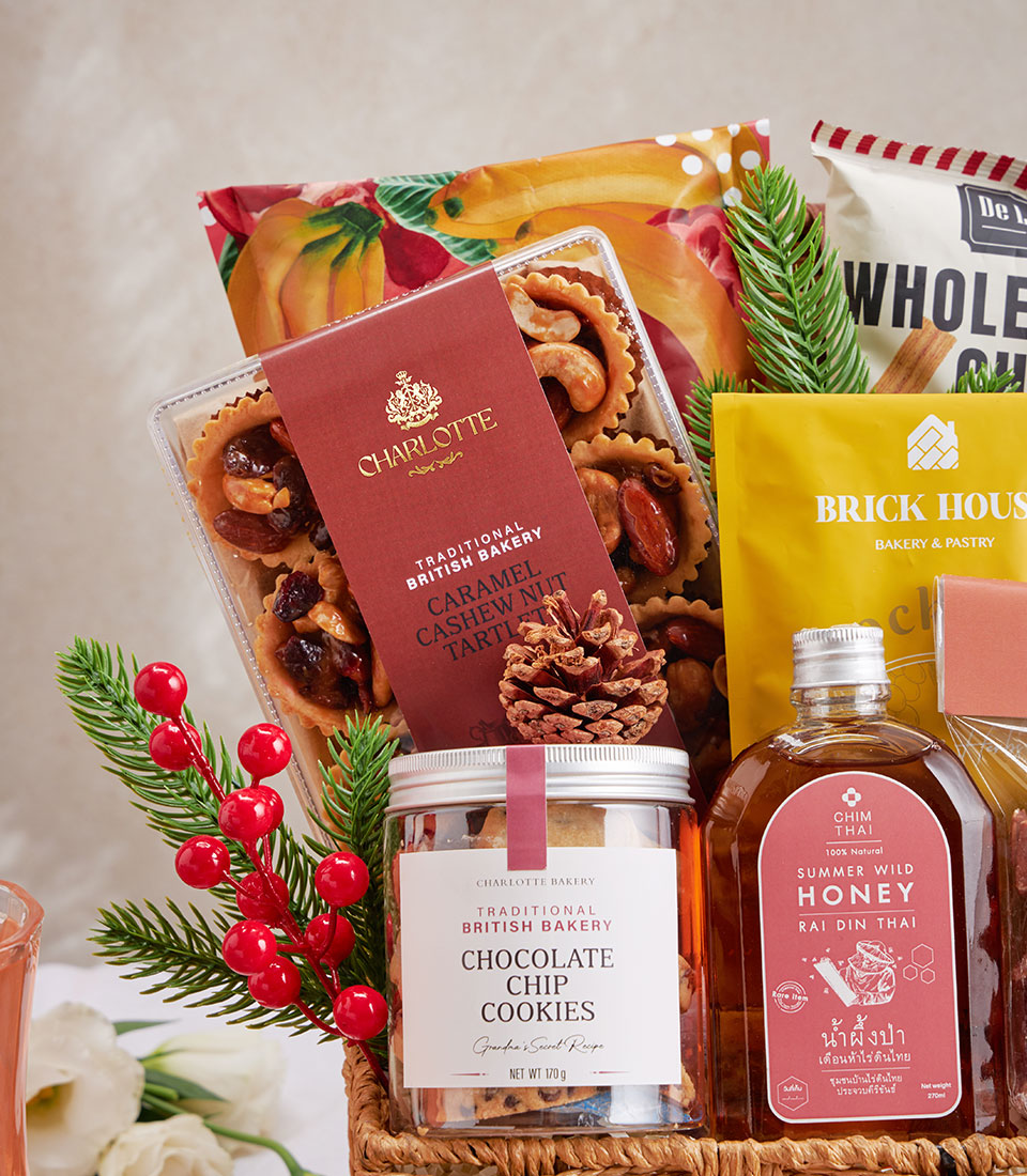 A delicious basket with banana paprika chips, wheat chips, Walkers shortbread, caramel tarts, olive herb snacks, coffee, honey, cookies and guava juice. A warm thoughtful gift.