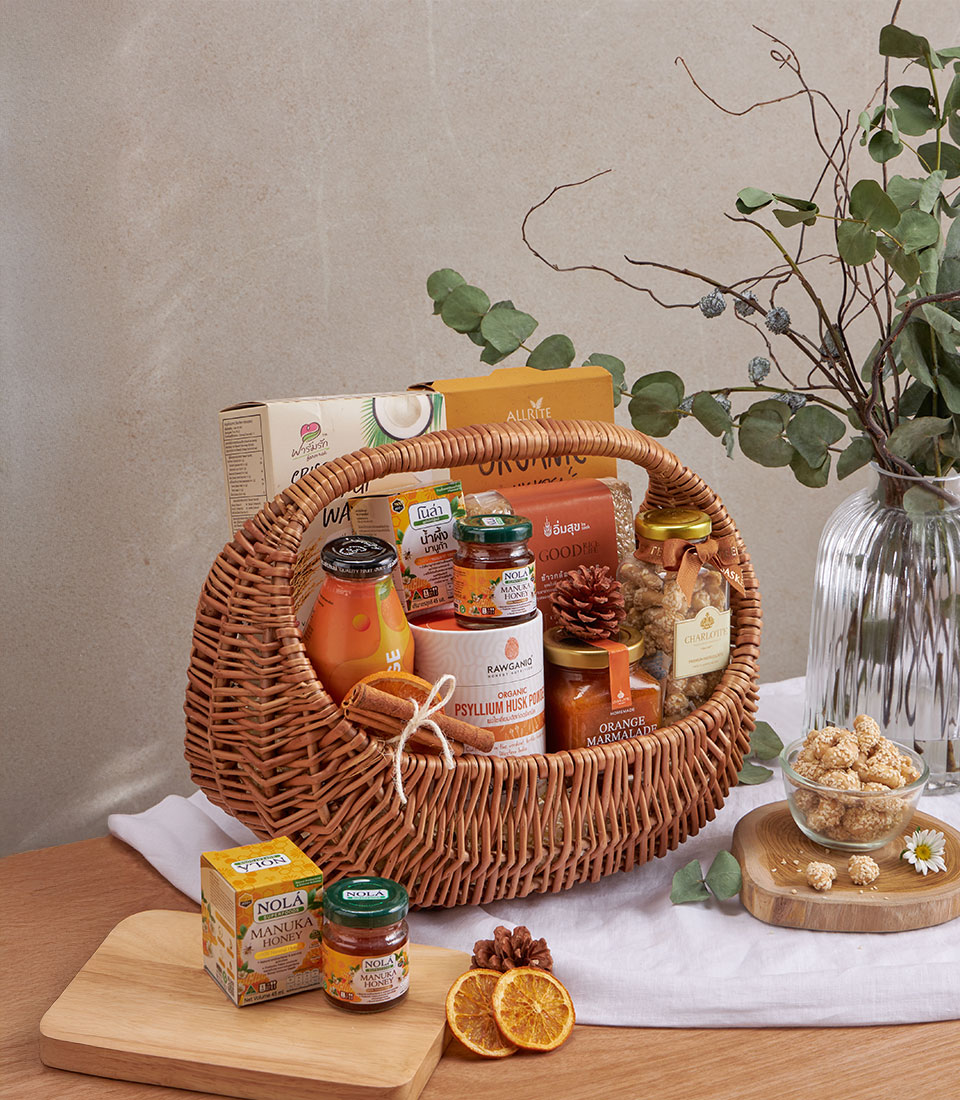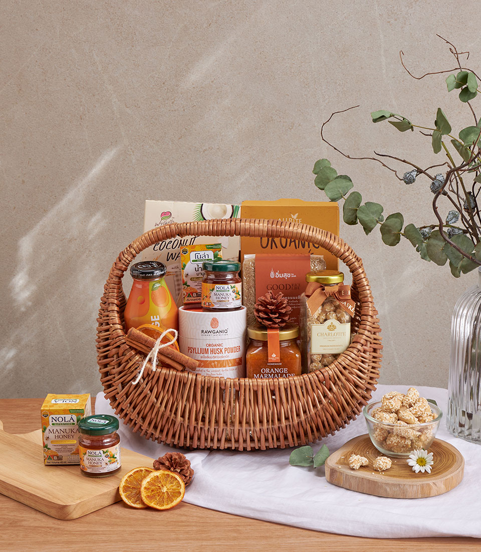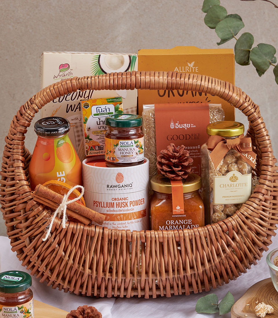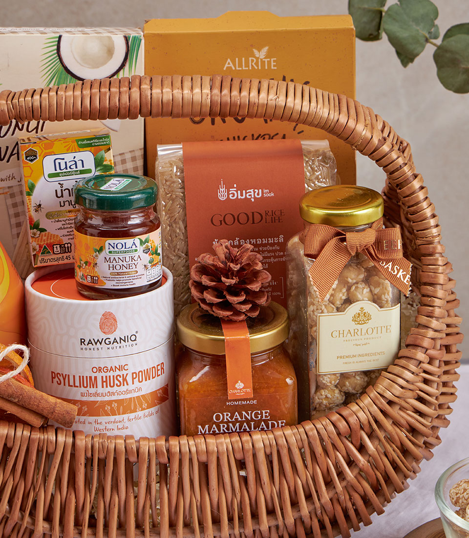 A wellness basket featuring rice snacks, chickpea pasta, jasmine rice, orange juice, Manuka honey, marmalade, and nuts.