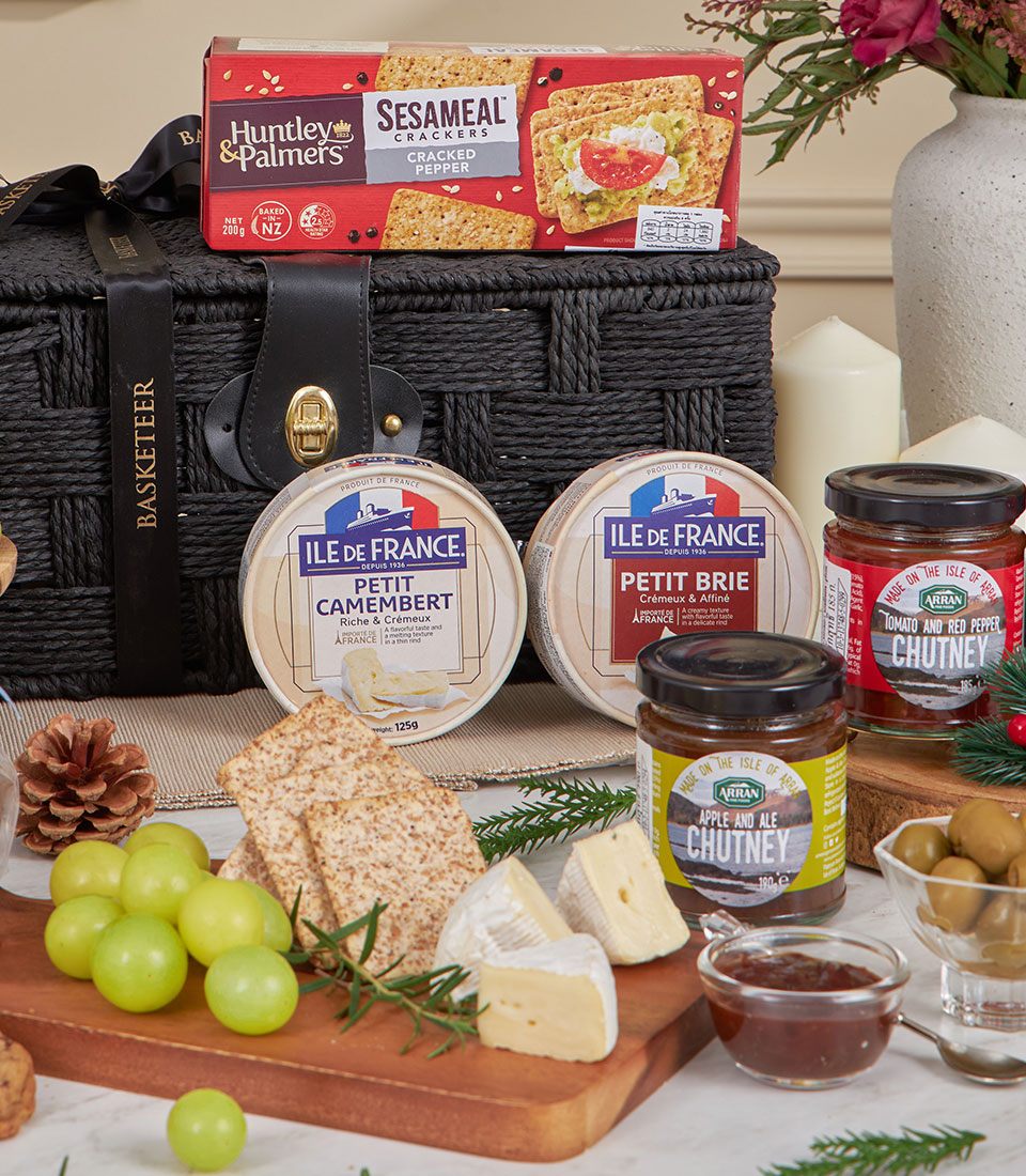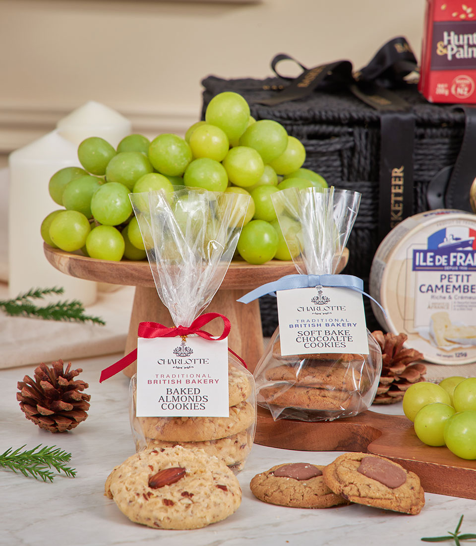 Gourmet Cheese & Fresh Grapes Hamper A luxurious black-themed cheese and fruit hamper featuring crisp imported green seedless grapes, premium European cheeses, artisan crackers, olives and chutneys, paired with Charlotte’s signature cookies. Elegantly arranged in Basketeer’s woven basket, this stylish set is perfect for wine-and-cheese evenings, corporate gifting and New Year celebrations in Bangkok.