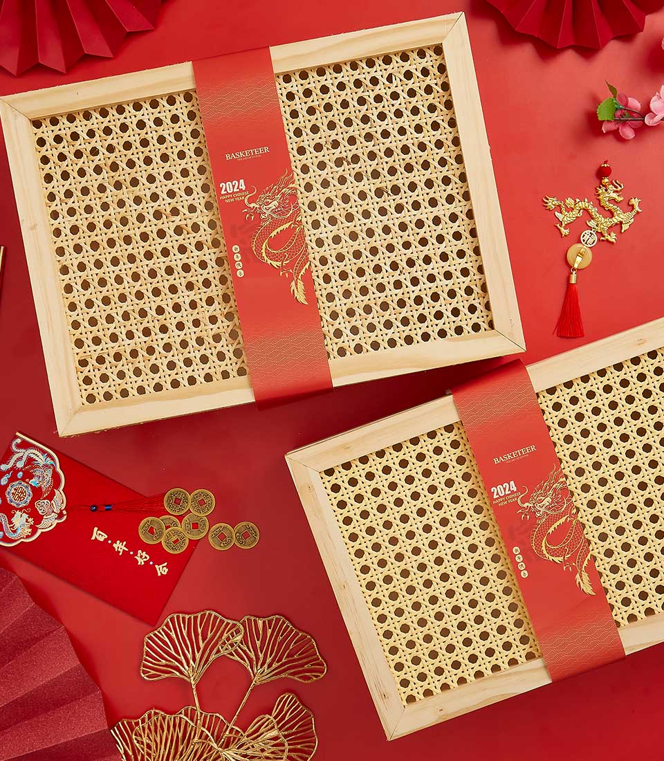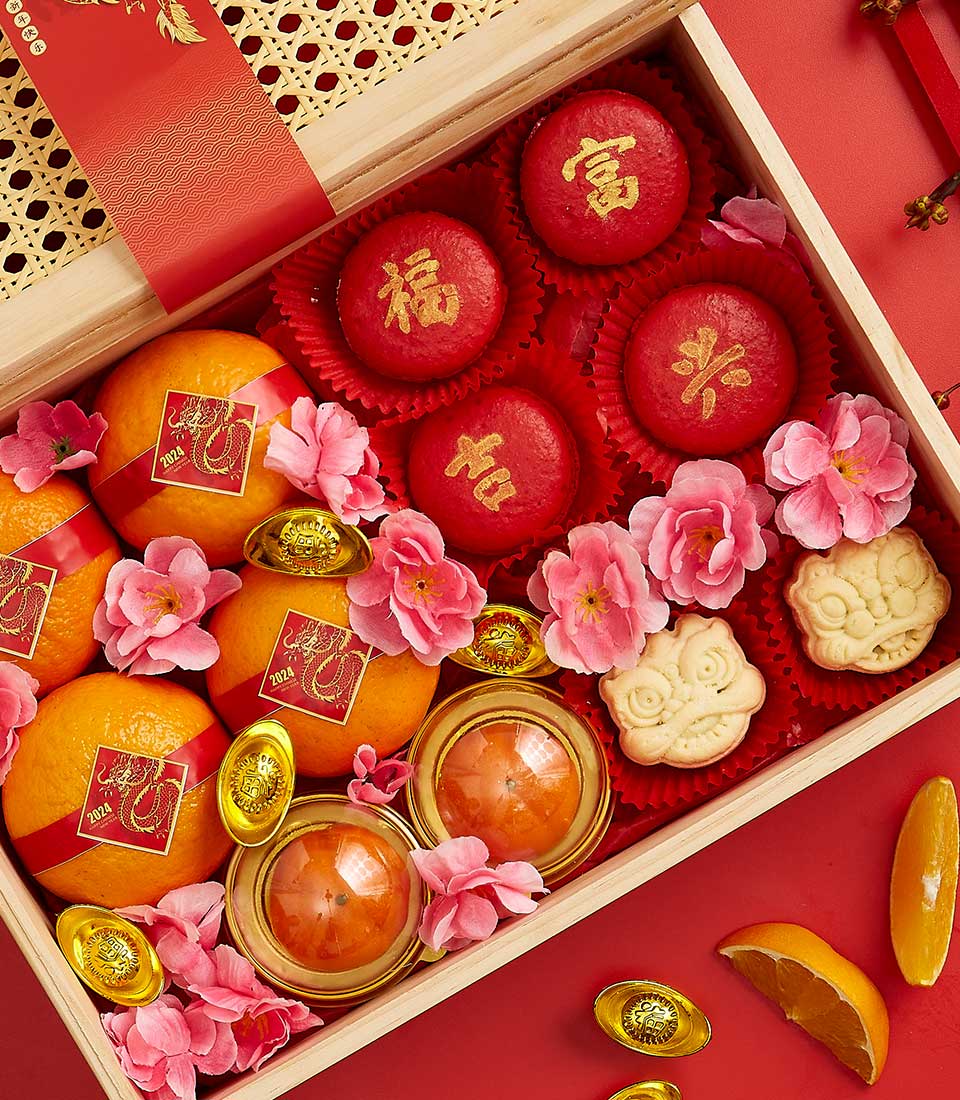 CNY : Joyful Lunar Citrus and Sweets Basket Celebrate the New Year with this elegant gift box. Includes fresh mandarins, festive cookies, symbolic red treats, and golden ingots to share luck and prosperity. Perfect for gifting loved ones or colleagues.