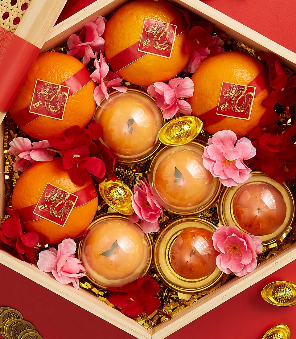 CNY : Joyful Sweets With Mandarin Blessings Gift Welcome prosperity with the Festive Mandarin Orange & Cake Gift Set. This elegant hexagonal box is filled with juicy oranges, delightful mandarin cakes, gold ingots, and vibrant florals, making it the ideal gift for Lunar New Year celebrations.