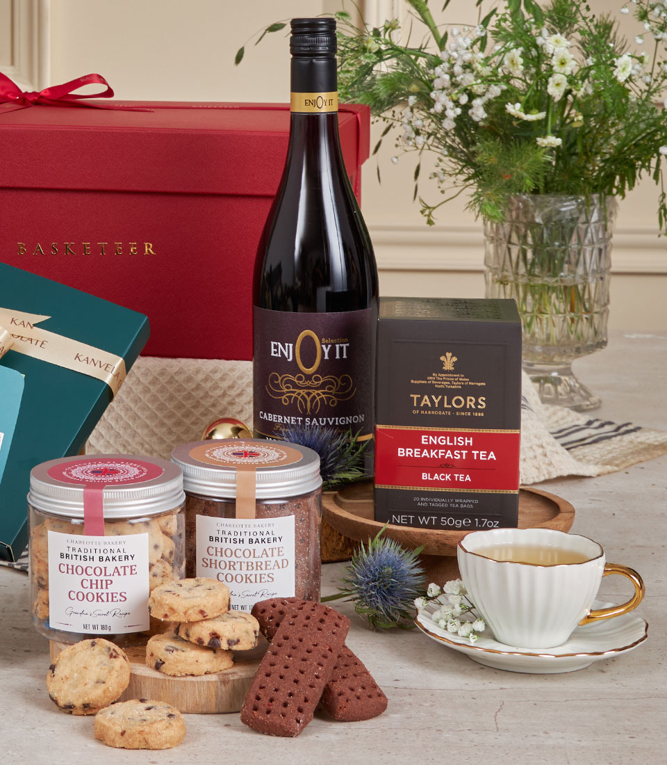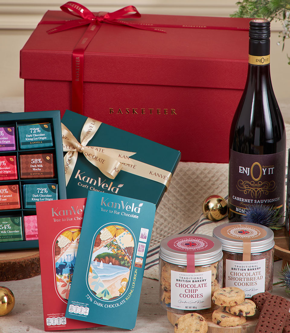 Luxurious red box featuring Kanvela chocolates, chocolate chip cookies, English tea and non-alcoholic cabernet for indulgent yet alcohol-free gifting.