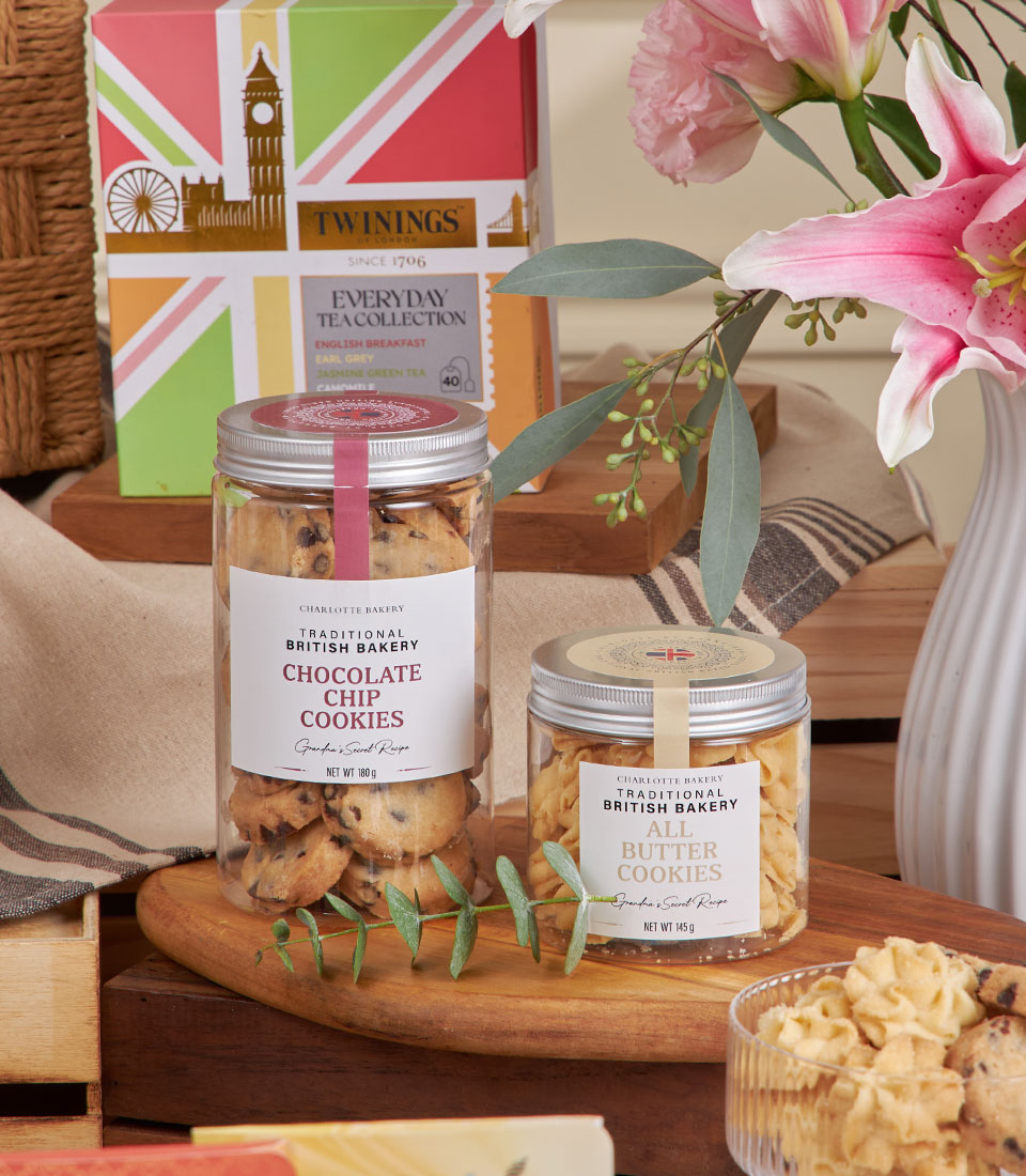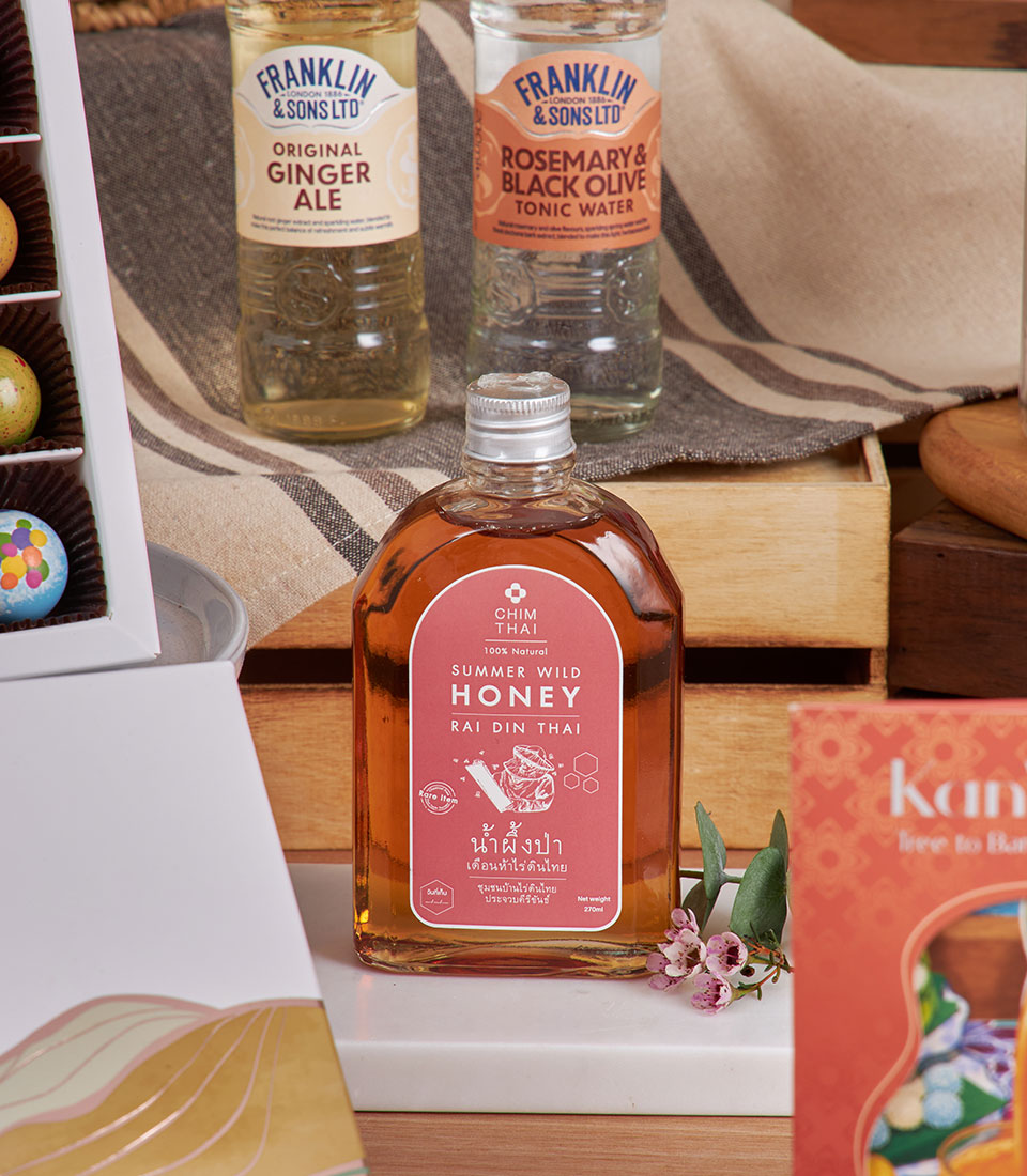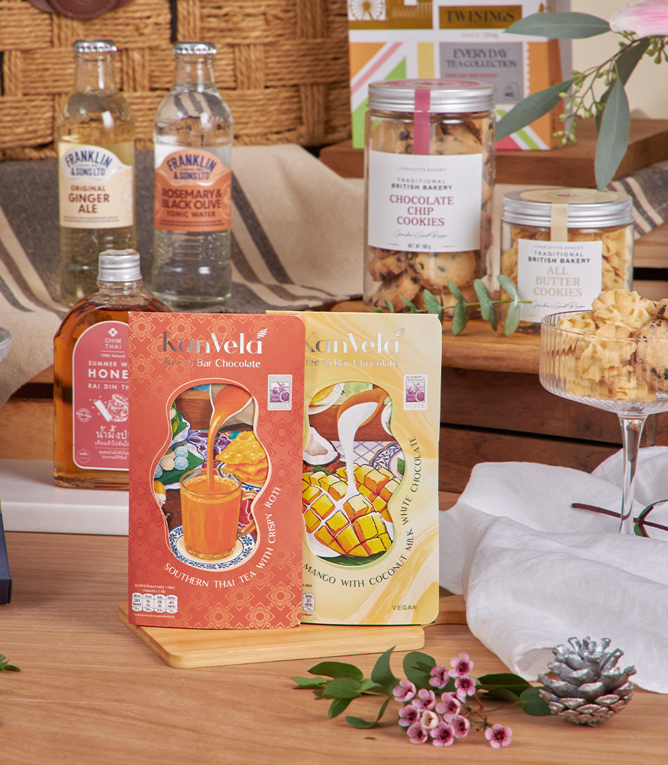 London & Thai Delight Hamper A charming fusion of British favourites and Thai artisanal treats — tea, bonbons, honey and cookies arranged in a refined basket for thoughtful, memorable gifting.