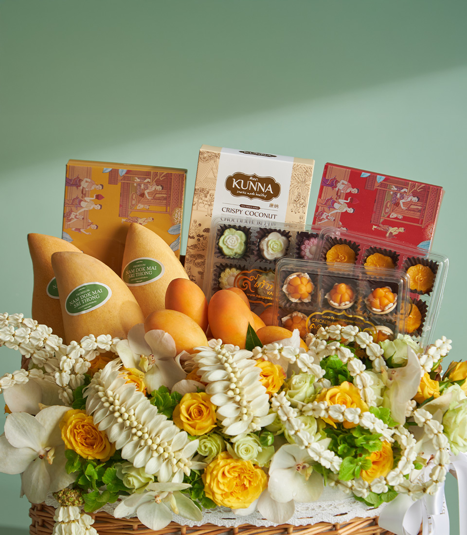 Songkran Blessing Gift Hamper Celebrate Songkran with a luxurious gift basket featuring golden Nam Dok Mai mangoes, premium Mayongchids, and auspicious Thai sweets. Beautifully adorned with fresh jasmine garlands and floral decor — perfect for elders and loved ones.