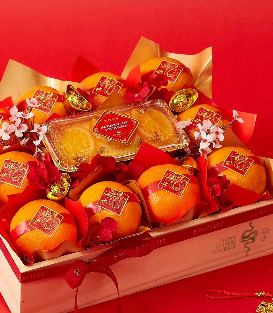 Delight your loved ones this Chinese New Year with a luxurious gift box filled with premium oranges and festive Mandarin pastries.