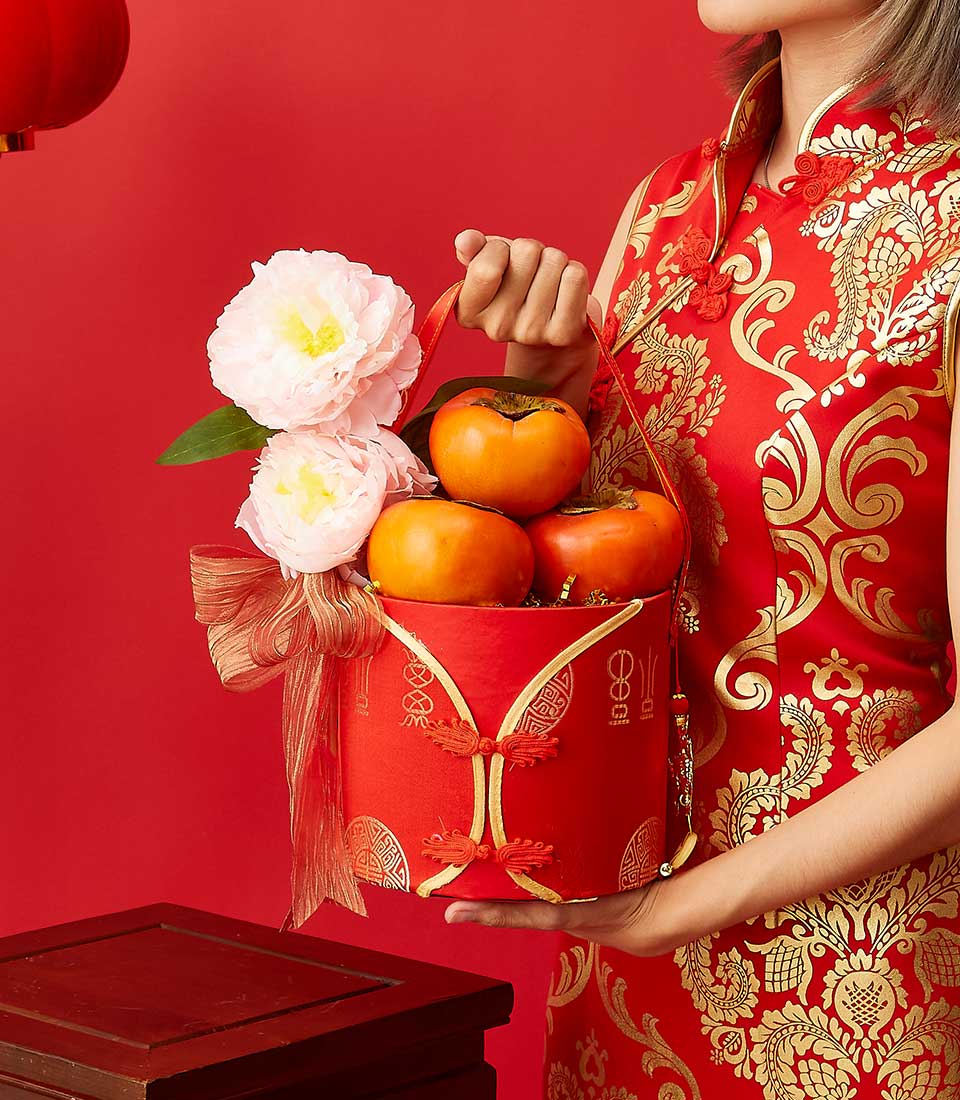 CNY : Lunar New Year Persimmon Bliss Gift Celebrate the Lunar New Year with this elegant red basket filled with ripe persimmons symbolizing prosperity and abundance. The vibrant design features pink peonies and gold accents making it a perfect gift for loved ones or business partners. Share festive blessings in style with this meaningful gift.