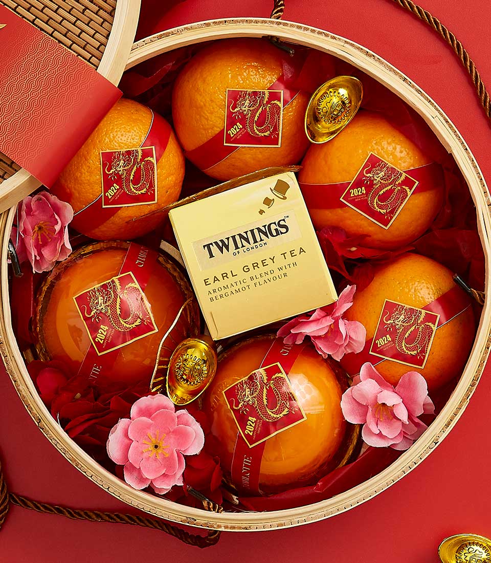 CNY : Lunar Packet Joyful Surprise Gift Celebrate Chinese New Year with the perfect harmony of Twinings Earl Grey tea and fresh mandarins. This thoughtfully curated gift basket symbolizes prosperity and joy while offering a refreshing blend of flavors. Adorned with festive floral touches it is an elegant way to share happiness and good fortune.