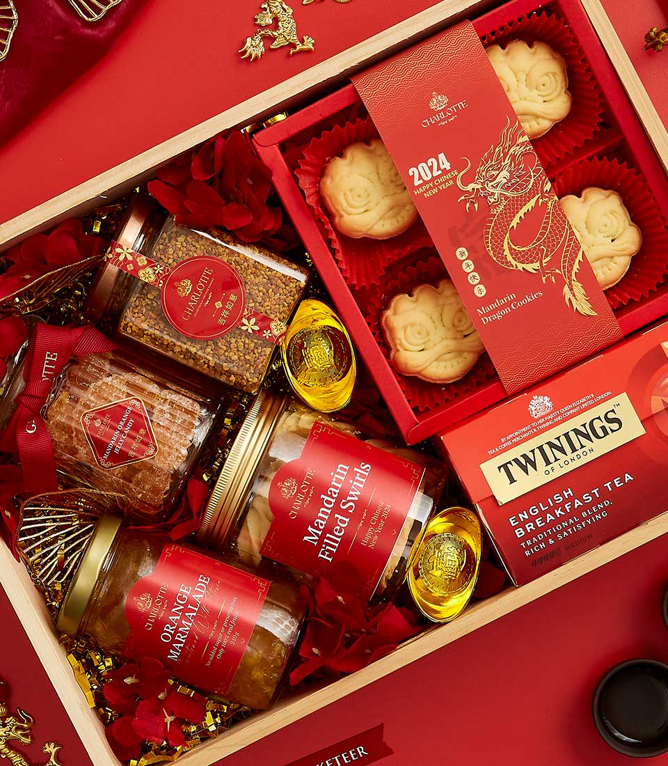 Celebrate Lunar New Year with a tea hamper featuring Twinings tea, mandarin cookies, marmalade, and symbolic gold ingots.