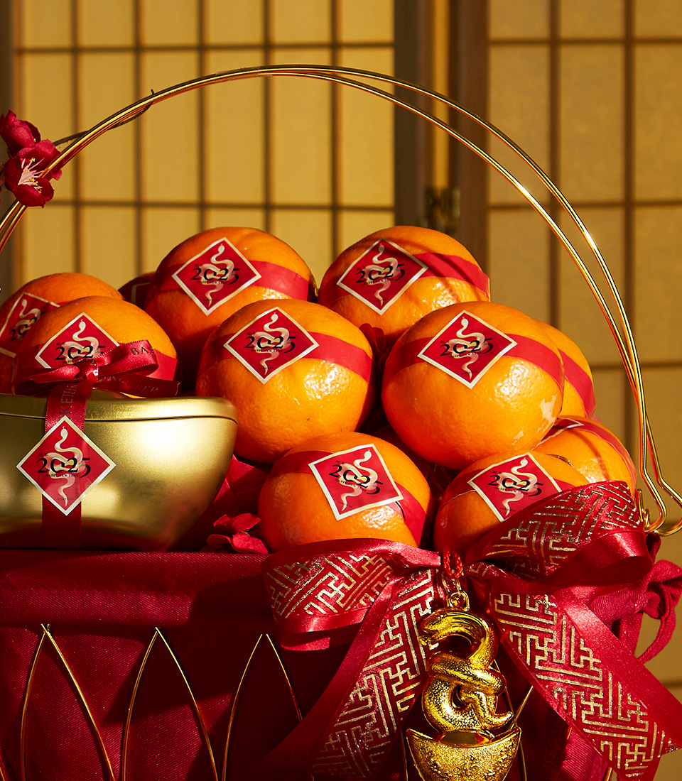 Luxurious Chinese New Year basket with premium oranges, gold accents, and festive red decor. Perfect for prosperity and joy.